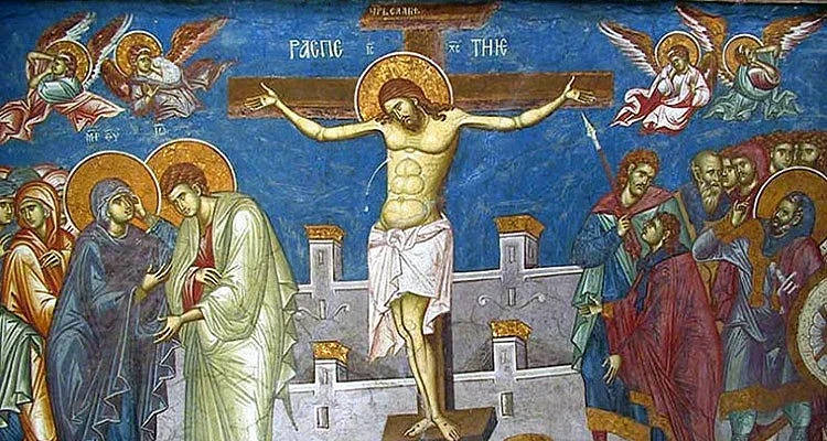 волно приел да бъде съден, бичуван, оплют, бит с плесници и показан пред народа в багреница за поругание, с кръст в ръка и с венец от тръни на главата. Нарамен с тежък кръст от преторията на Пилата, Христос бил поведен към Голгота на разпятие. Разпнат между двама разбойника за поругание при страшни природни смущения - земетръс и затъмнение на слънцето, издъхнал, приел смърт, за да избави от смърт цялото човечество.