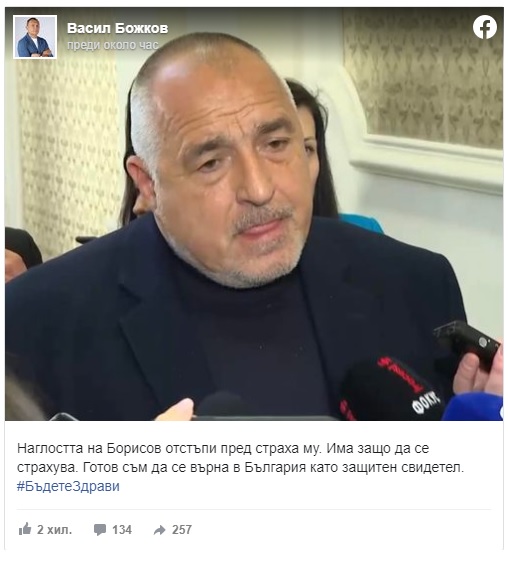 "Наглостта на Борисов отстъпи пред страха му. Има защо да се страхува. Готов съм да се върна в България като защитен свидетел", написа днес Васил Божков във Фейсбук.