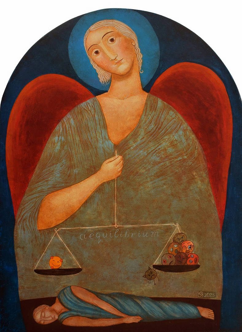 Те функционират като технологични шаблони, които свеждат нюансите на преживяването до повторяем код и често заменят богатството на вътрешния свят с унифициран знак. Чрез своя характерен зрял и искрен наив авторката ги издига до символно равнище, където те придобиват духовна и сетивна плътност. Напуснали стерилната самота на екрана, малките личица се впускат в изконното човешко пътуване - от градината на Едем до сиянието на ангелските сънища.
