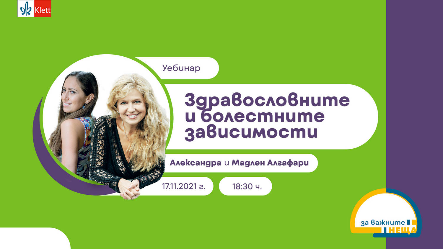 Има ли безопасни и дори полезни зависимости в живота - ще дискутират по време на безплатен уебинар психотерапевтката и писателка Мадлен Алгафари и нейната дъщеря Александра, последвала примера на майка си в професията. Събитието, което ще стане факт днес, 17 ноември, от 18,30 ч., е една от разнообразните инициативи от кампанията "За важните неща", организирана от издателство "Клет България".