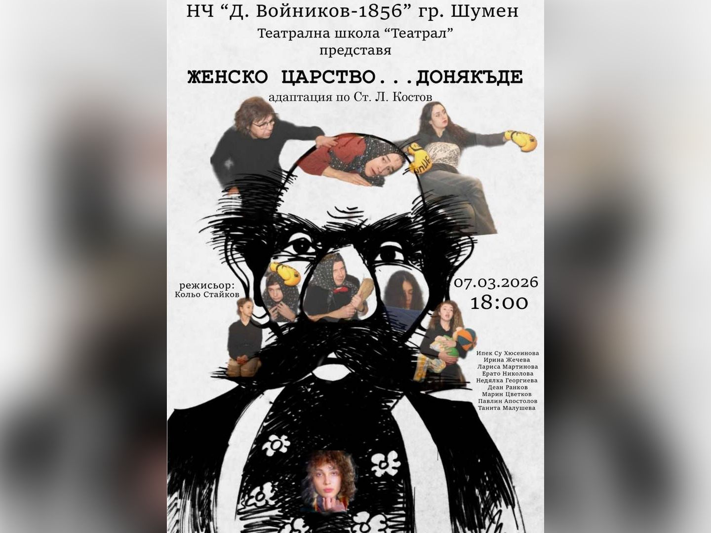 Актьорската школа "Театрал" към Народно читалище "Добри Войников - 1856" в Шумен ще представи на 7 март "Женско царство... донякъде", адаптация по Ст. Л. Костов на режисьора Кольо Стайков, съобщават от библиотеката към културната институция. Спектакълът съчетава класическия комедиен текст със съвременна интерпретация. Премиерата ще бъде от 18 ч. в концертната зала на читалището. В ролите са: Ирина Жечева, Лариса Мартинова, Ерато Николова, Недялка Георгиева, Деан Ранков, Марин Цветков, както и новите попълнения в трупата: Ипек Су Хюсеинова, Павлин Апостолов и Танита Малушева, добавят от библиотеката към шуменското читалище.