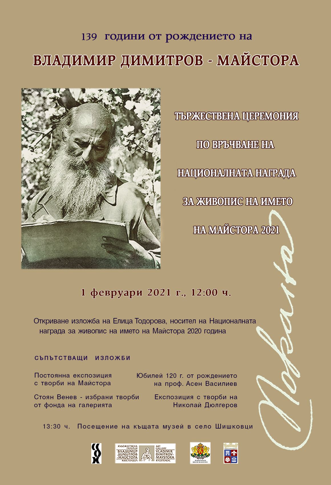 Малцина са онези, които осмислят живота си по начин, който им отрежда заслужено място във вечността. Те са неподвластни на забравата, защото е светла дирята им. Те са нашата сила в слабостта, упование и светлина. И съвсем обяснимо е преклонението пред подобни личности и завещаното от тях. Името на Владимир Димитров - Майстора неизменно поражда чувство на национална гордост. Сътвореното от художника е отражение на България и нравствените ценности на българина. Майстора твърдо вярва в предназначението на изкуството - да просветли, да издигне, да облагороди и обогати човешката душа и да я води към съвършенството. И го доказва с творчеството си. Тази година честваме 139 години от рождението на бележития художник.