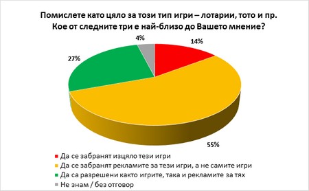 На този фон 5% от запитаните твърдят, че редовно играят игри като тото, лотария, посягат към форми на хазарт и т.н. Те се равняват условно на близо 300 хиляди души. Тези хора харчат средно по 43 лв месечно за такъв тип игри.