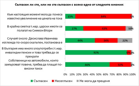 Идеята на БСП за намаляването на депутатските заплати се одобрява от 91 процента от българите. Това показват данните от експресно телефонно проучване на "Галъп интернешенъл" по актуални политически теми. Като цяло в обществото има очакване за повече обществена, социална и съдебна справедливост, българите искат да видят по-твърди действия на властта срещу корупцията и престъпността, коментират социолозите. Огромната част от запитаните - 84% - казват, че не биха понесли финансово ново увеличение на цената на тока. 92 на сто пък са съгласни с твърдението, че има много злоупотреби с т.нар. инвалидни пенсии и че това трябва да спре. Сънародниците ни са чувствителни и по темата за българите, за които САЩ искат екстрадиция. 60% одобряват отказа на прокуратурата да екстрадира Желяз Андреев и за арестува колегите му.