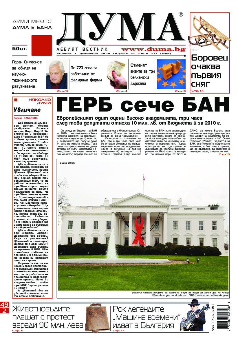 АБОНАМЕНТ за вестник „ДУМА“ за 2026 година. Можете да се абонирате в: „Български пощи“ АД до 15 декември 2025 г., „Доби прес“ ЕООД до 28 декември 2025 г., в редакцията на вестника до 20 декември 2025 г. Каталожен номер 6. Цени: 12 месеца - 149 € / 291,42 лв., 6 месеца - 75 € / 146,69 лв., 3 месеца - 40 € / 78,23 лв., 1 месец - 14 € / 27,38 лв. За повече информация тел. 02 9705 203 и 02 9705 216 отдел „Разпространение” на в-к ДУМА на ул. „Позитано” 20 А. E-mail: abonament@duma.bg АБОНАМЕНТ за вестник „ДУМА“ за 2026 година. Можете да се абонирате в: „Български пощи“ АД до 15 декември 2025 г., „Доби прес“ ЕООД до 28 декември 2025 г., в редакцията на вестника до 20 декември 2025 г. Каталожен номер 6. Цени: 12 месеца - 149 € / 291,42 лв., 6 месеца - 75 € / 146,69 лв., 3 месеца - 40 € / 78,23 лв., 1 месец - 14 € / 27,38 лв. За повече информация тел. 02 9705 203 и 02 9705 216 отдел „Разпространение” на в-к ДУМА на ул. „Позитано” 20 А. E-mail: abonament@duma.bg