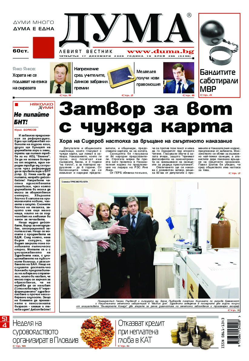 АБОНАМЕНТ за вестник „ДУМА“ за 2026 година. Можете да се абонирате в: „Български пощи“ АД до 15 декември 2025 г., „Доби прес“ ЕООД до 28 декември 2025 г., в редакцията на вестника до 20 декември 2025 г. Каталожен номер 6. Цени: 12 месеца - 149 € / 291,42 лв., 6 месеца - 75 € / 146,69 лв., 3 месеца - 40 € / 78,23 лв., 1 месец - 14 € / 27,38 лв. За повече информация тел. 02 9705 203 и 02 9705 216 отдел „Разпространение” на в-к ДУМА на ул. „Позитано” 20 А. E-mail: abonament@duma.bg АБОНАМЕНТ за вестник „ДУМА“ за 2026 година. Можете да се абонирате в: „Български пощи“ АД до 15 декември 2025 г., „Доби прес“ ЕООД до 28 декември 2025 г., в редакцията на вестника до 20 декември 2025 г. Каталожен номер 6. Цени: 12 месеца - 149 € / 291,42 лв., 6 месеца - 75 € / 146,69 лв., 3 месеца - 40 € / 78,23 лв., 1 месец - 14 € / 27,38 лв. За повече информация тел. 02 9705 203 и 02 9705 216 отдел „Разпространение” на в-к ДУМА на ул. „Позитано” 20 А. E-mail: abonament@duma.bg