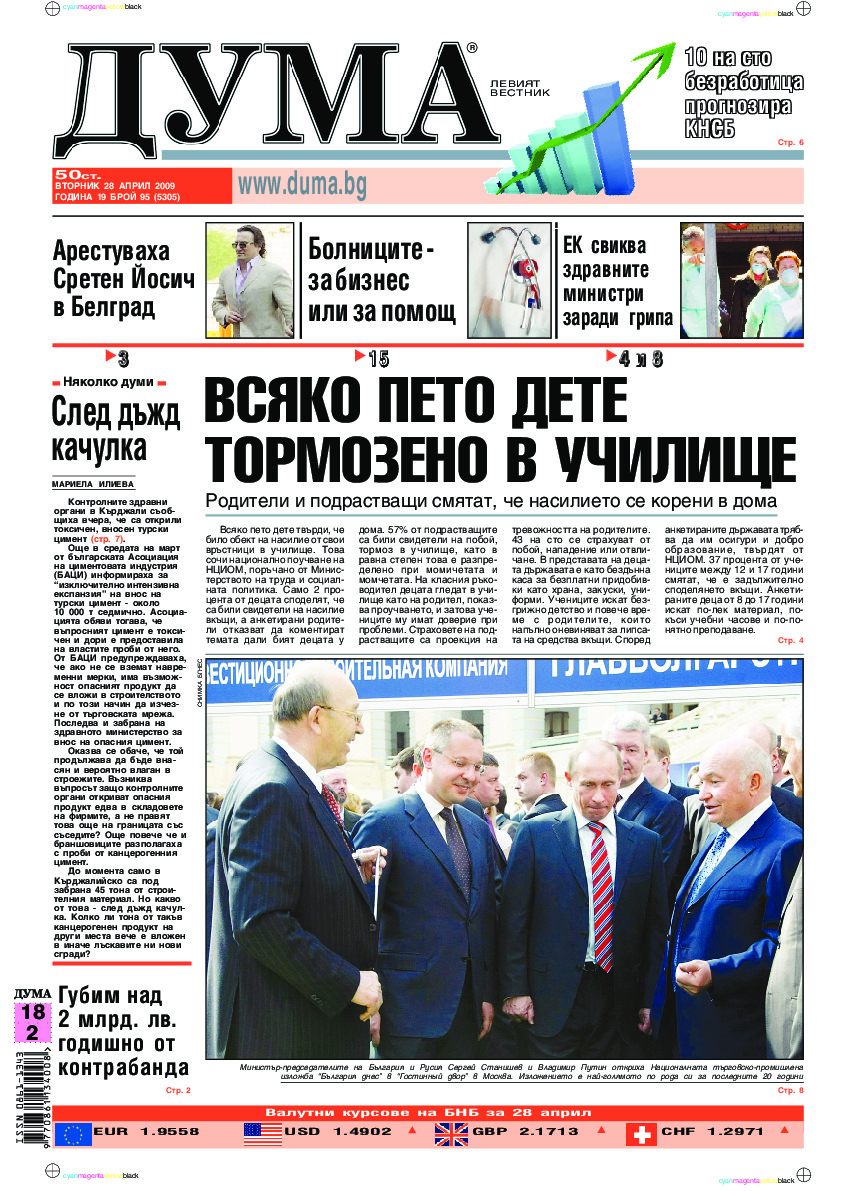 АБОНАМЕНТ за вестник „ДУМА“ за 2026 година. Можете да се абонирате в: „Български пощи“ АД до 15 декември 2025 г., „Доби прес“ ЕООД до 28 декември 2025 г., в редакцията на вестника до 20 декември 2025 г. Каталожен номер 6. Цени: 12 месеца - 149 € / 291,42 лв., 6 месеца - 75 € / 146,69 лв., 3 месеца - 40 € / 78,23 лв., 1 месец - 14 € / 27,38 лв. За повече информация тел. 02 9705 203 и 02 9705 216 отдел „Разпространение” на в-к ДУМА на ул. „Позитано” 20 А. E-mail: abonament@duma.bg АБОНАМЕНТ за вестник „ДУМА“ за 2026 година. Можете да се абонирате в: „Български пощи“ АД до 15 декември 2025 г., „Доби прес“ ЕООД до 28 декември 2025 г., в редакцията на вестника до 20 декември 2025 г. Каталожен номер 6. Цени: 12 месеца - 149 € / 291,42 лв., 6 месеца - 75 € / 146,69 лв., 3 месеца - 40 € / 78,23 лв., 1 месец - 14 € / 27,38 лв. За повече информация тел. 02 9705 203 и 02 9705 216 отдел „Разпространение” на в-к ДУМА на ул. „Позитано” 20 А. E-mail: abonament@duma.bg