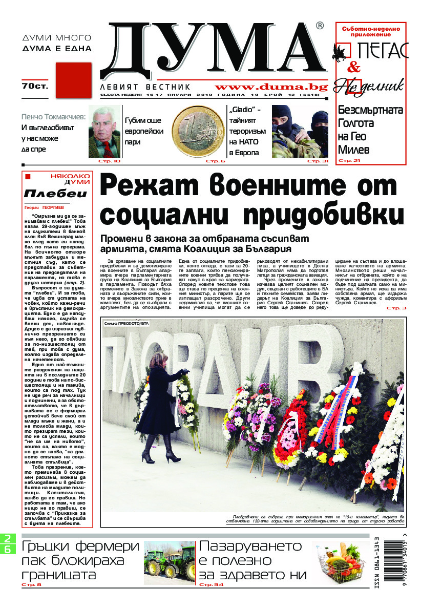 АБОНАМЕНТ за вестник „ДУМА“ за 2026 година. Можете да се абонирате в: „Български пощи“ АД до 15 декември 2025 г., „Доби прес“ ЕООД до 28 декември 2025 г., в редакцията на вестника до 20 декември 2025 г. Каталожен номер 6. Цени: 12 месеца - 149 € / 291,42 лв., 6 месеца - 75 € / 146,69 лв., 3 месеца - 40 € / 78,23 лв., 1 месец - 14 € / 27,38 лв. За повече информация тел. 02 9705 203 и 02 9705 216 отдел „Разпространение” на в-к ДУМА на ул. „Позитано” 20 А. E-mail: abonament@duma.bg АБОНАМЕНТ за вестник „ДУМА“ за 2026 година. Можете да се абонирате в: „Български пощи“ АД до 15 декември 2025 г., „Доби прес“ ЕООД до 28 декември 2025 г., в редакцията на вестника до 20 декември 2025 г. Каталожен номер 6. Цени: 12 месеца - 149 € / 291,42 лв., 6 месеца - 75 € / 146,69 лв., 3 месеца - 40 € / 78,23 лв., 1 месец - 14 € / 27,38 лв. За повече информация тел. 02 9705 203 и 02 9705 216 отдел „Разпространение” на в-к ДУМА на ул. „Позитано” 20 А. E-mail: abonament@duma.bg
