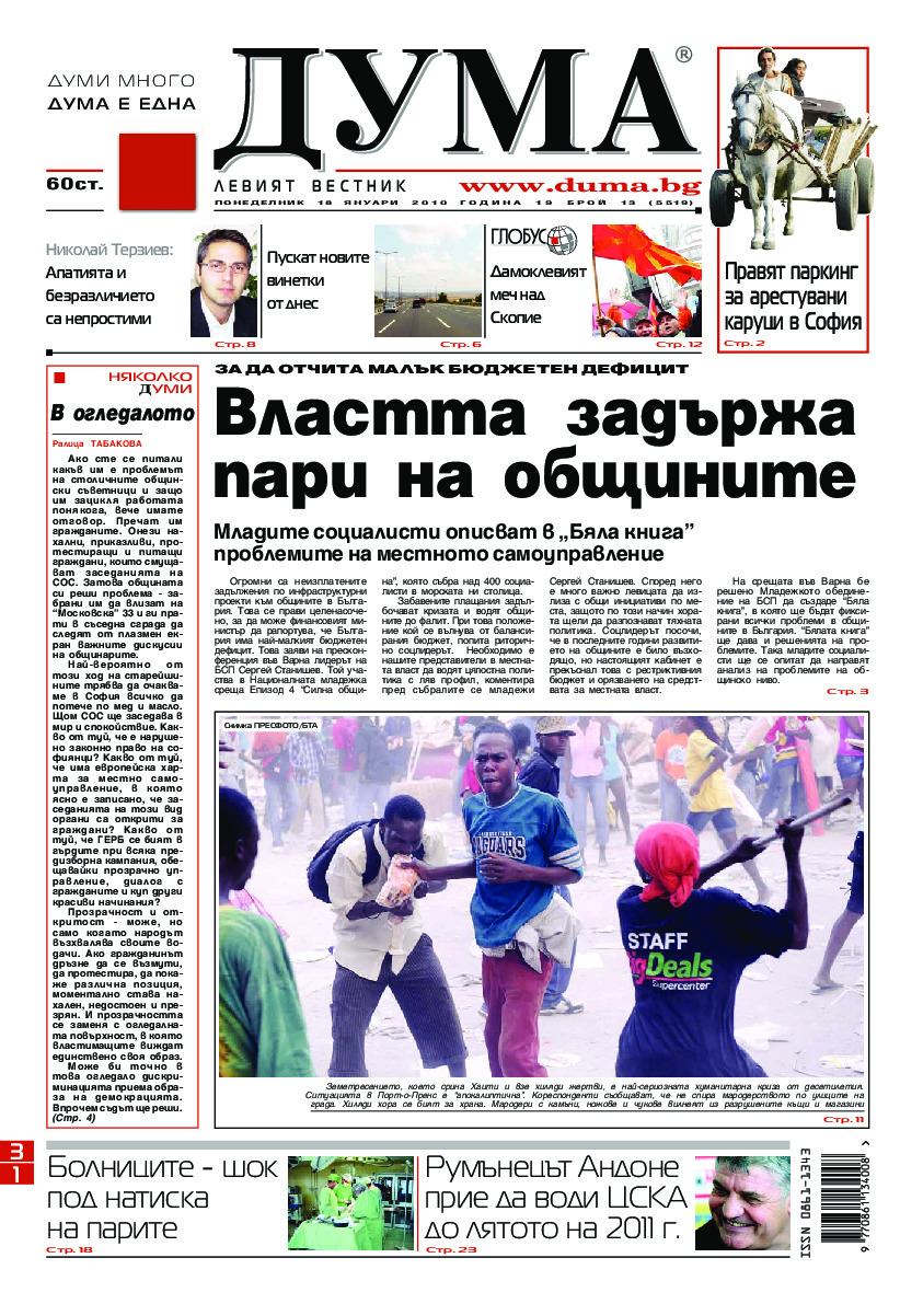 АБОНАМЕНТ за вестник „ДУМА“ за 2026 година. Можете да се абонирате в: „Български пощи“ АД до 15 декември 2025 г., „Доби прес“ ЕООД до 28 декември 2025 г., в редакцията на вестника до 20 декември 2025 г. Каталожен номер 6. Цени: 12 месеца - 149 € / 291,42 лв., 6 месеца - 75 € / 146,69 лв., 3 месеца - 40 € / 78,23 лв., 1 месец - 14 € / 27,38 лв. За повече информация тел. 02 9705 203 и 02 9705 216 отдел „Разпространение” на в-к ДУМА на ул. „Позитано” 20 А. E-mail: abonament@duma.bg АБОНАМЕНТ за вестник „ДУМА“ за 2026 година. Можете да се абонирате в: „Български пощи“ АД до 15 декември 2025 г., „Доби прес“ ЕООД до 28 декември 2025 г., в редакцията на вестника до 20 декември 2025 г. Каталожен номер 6. Цени: 12 месеца - 149 € / 291,42 лв., 6 месеца - 75 € / 146,69 лв., 3 месеца - 40 € / 78,23 лв., 1 месец - 14 € / 27,38 лв. За повече информация тел. 02 9705 203 и 02 9705 216 отдел „Разпространение” на в-к ДУМА на ул. „Позитано” 20 А. E-mail: abonament@duma.bg