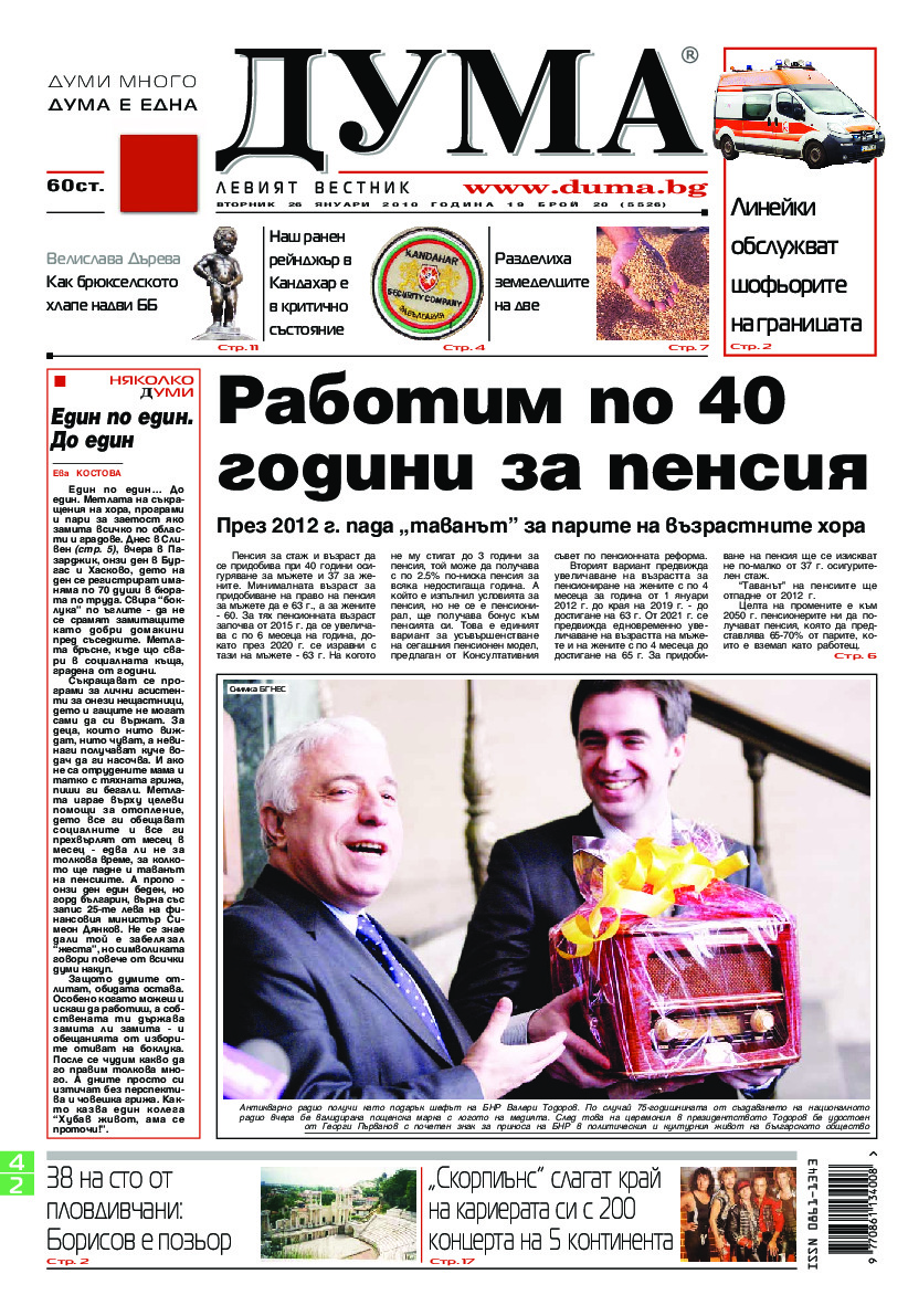 АБОНАМЕНТ за вестник „ДУМА“ за 2026 година. Можете да се абонирате в: „Български пощи“ АД до 15 декември 2025 г., „Доби прес“ ЕООД до 28 декември 2025 г., в редакцията на вестника до 20 декември 2025 г. Каталожен номер 6. Цени: 12 месеца - 149 € / 291,42 лв., 6 месеца - 75 € / 146,69 лв., 3 месеца - 40 € / 78,23 лв., 1 месец - 14 € / 27,38 лв. За повече информация тел. 02 9705 203 и 02 9705 216 отдел „Разпространение” на в-к ДУМА на ул. „Позитано” 20 А. E-mail: abonament@duma.bg АБОНАМЕНТ за вестник „ДУМА“ за 2026 година. Можете да се абонирате в: „Български пощи“ АД до 15 декември 2025 г., „Доби прес“ ЕООД до 28 декември 2025 г., в редакцията на вестника до 20 декември 2025 г. Каталожен номер 6. Цени: 12 месеца - 149 € / 291,42 лв., 6 месеца - 75 € / 146,69 лв., 3 месеца - 40 € / 78,23 лв., 1 месец - 14 € / 27,38 лв. За повече информация тел. 02 9705 203 и 02 9705 216 отдел „Разпространение” на в-к ДУМА на ул. „Позитано” 20 А. E-mail: abonament@duma.bg