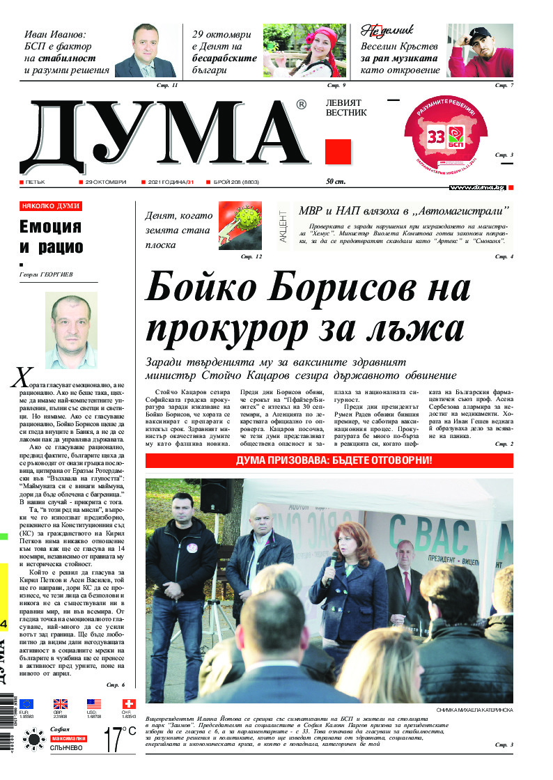 Министърът на здравеопазването Стойчо Кацаров сезира Софийската градска прокуратура заради изказване на бившия премиер Бойко Борисов, че хората се ваксинират с препарати с изтекъл срок. Думите му са окачествени като фалшива новина. На 24 октомври Борисов твърдеше, че срокът на ваксините "Пфайзер/Био...