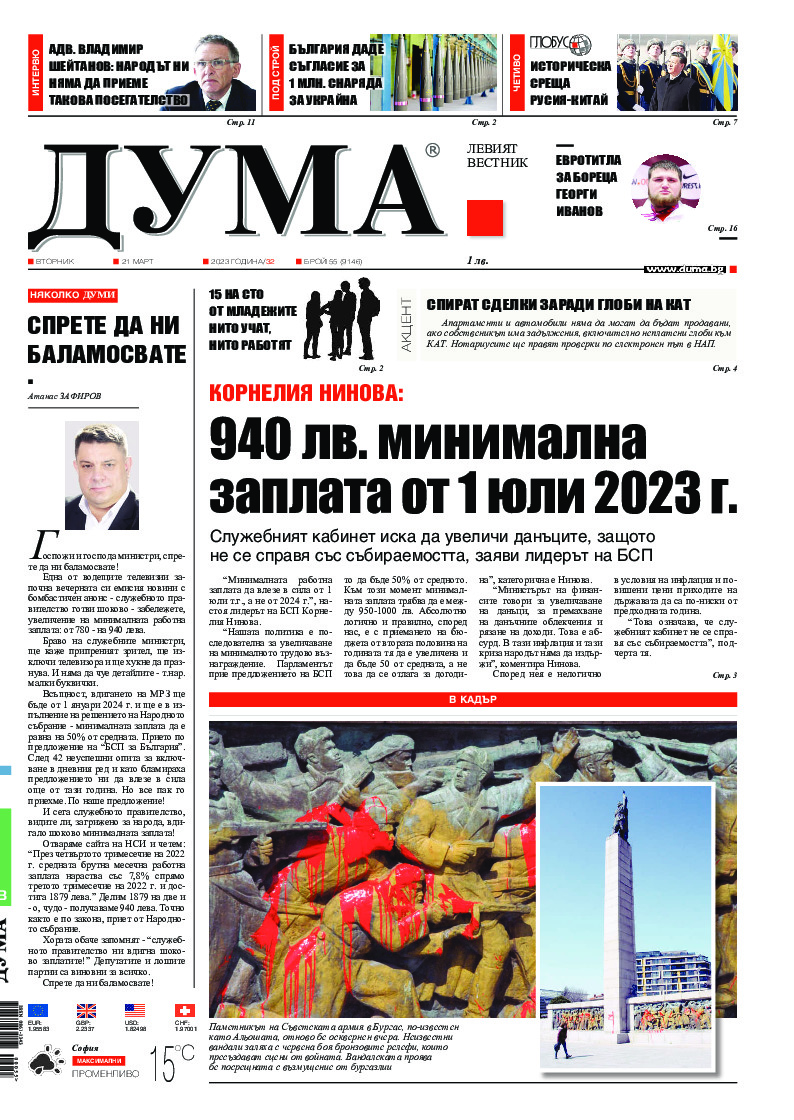 "Минималната работна заплата да влезе в сила от 1 юли т.г., а не от 2024 година, настоя лидерът на БСП Корнелия Нинова в тв интервю. "Министърът на финансите говори за увеличаване на данъци, за премахване на данъчните облекчения и рязане на доходи. Това е абсурд. В тази инфлация и тази криза, народъ...