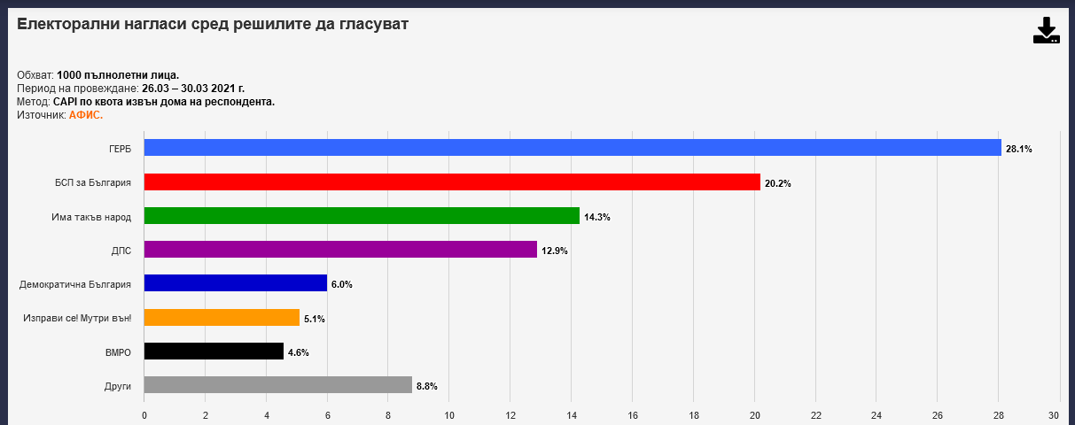 Изборният резултат ще произведе Народно събрание със съмнителна легитимност и вещае краткосрочен живот на бъдещия кабинет. Това показва анализ на агенция АФИС на база на проучване от последните дни преди вота на 4 април.