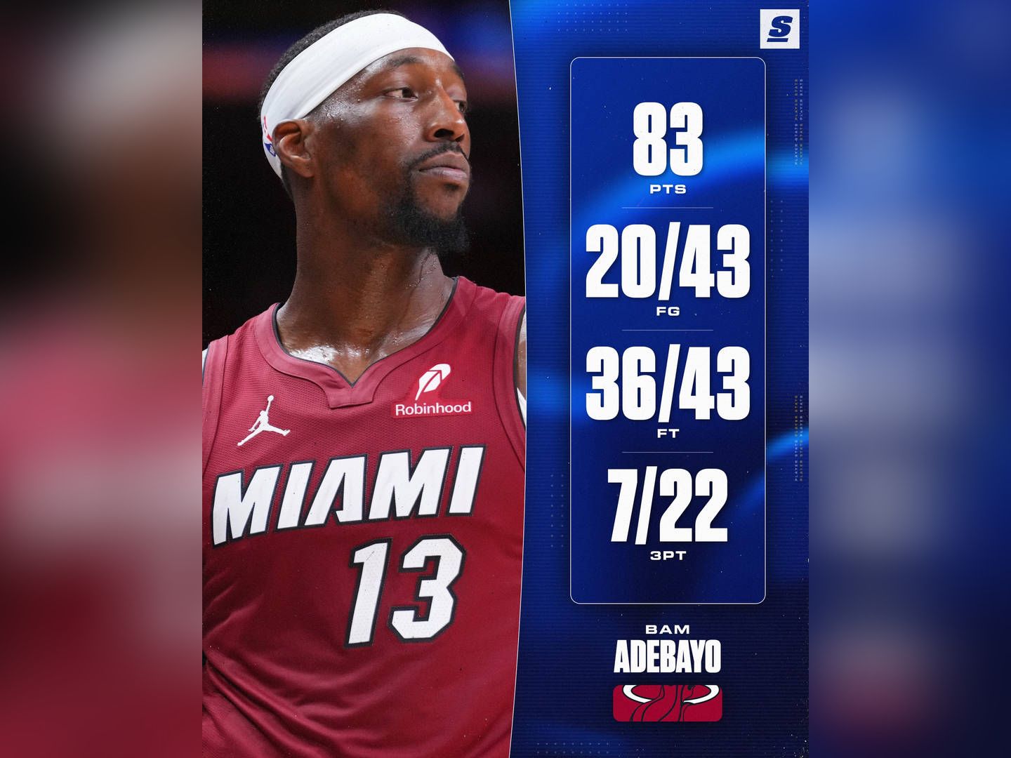 Бам Адебайо наниза 83 точки при победата на Маями Хийт срещу Вашингтон Уизардс със 150:129 и записа второто най-добро постижение в историята на Националната баскетболна асоциация. Центърът отбеляза 31 т. само в първата четвърт и още 12 във втората. След почивката той отбеляза още 40 т., като вкара 20 от 43 опита от игра, 36 от 43 от фаул линията, както и 7 тройки от 22 опита. Отбелязаните наказателни удари, както и броят опити от линията на 28-годишния американец са също рекорди за НБА. Адебайо задмина 100-точковото представяне на легендарния Уилт Чембърлейн, в което тогавашният играч на Филаделфия Уориърс вкара 28 пъти от наказателната линия.