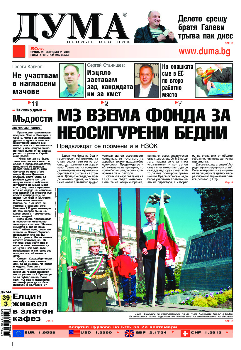 АБОНАМЕНТ за вестник „ДУМА“ за 2026 година. Можете да се абонирате в: „Български пощи“ АД до 15 декември 2025 г., „Доби прес“ ЕООД до 28 декември 2025 г., в редакцията на вестника до 20 декември 2025 г. Каталожен номер 6. Цени: 12 месеца - 149 € / 291,42 лв., 6 месеца - 75 € / 146,69 лв., 3 месеца - 40 € / 78,23 лв., 1 месец - 14 € / 27,38 лв. За повече информация тел. 02 9705 203 и 02 9705 216 отдел „Разпространение” на в-к ДУМА на ул. „Позитано” 20 А. E-mail: abonament@duma.bg АБОНАМЕНТ за вестник „ДУМА“ за 2026 година. Можете да се абонирате в: „Български пощи“ АД до 15 декември 2025 г., „Доби прес“ ЕООД до 28 декември 2025 г., в редакцията на вестника до 20 декември 2025 г. Каталожен номер 6. Цени: 12 месеца - 149 € / 291,42 лв., 6 месеца - 75 € / 146,69 лв., 3 месеца - 40 € / 78,23 лв., 1 месец - 14 € / 27,38 лв. За повече информация тел. 02 9705 203 и 02 9705 216 отдел „Разпространение” на в-к ДУМА на ул. „Позитано” 20 А. E-mail: abonament@duma.bg
