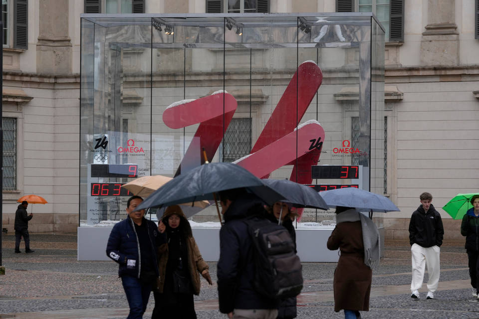 Много хора се разхождат, макар и в дъжда, пред часовника за обратно броене до старта на Зимната олимпиада в Милано-Кортина. Церемонията по откриването ще е на легендарния ст. "Сан Сиро"