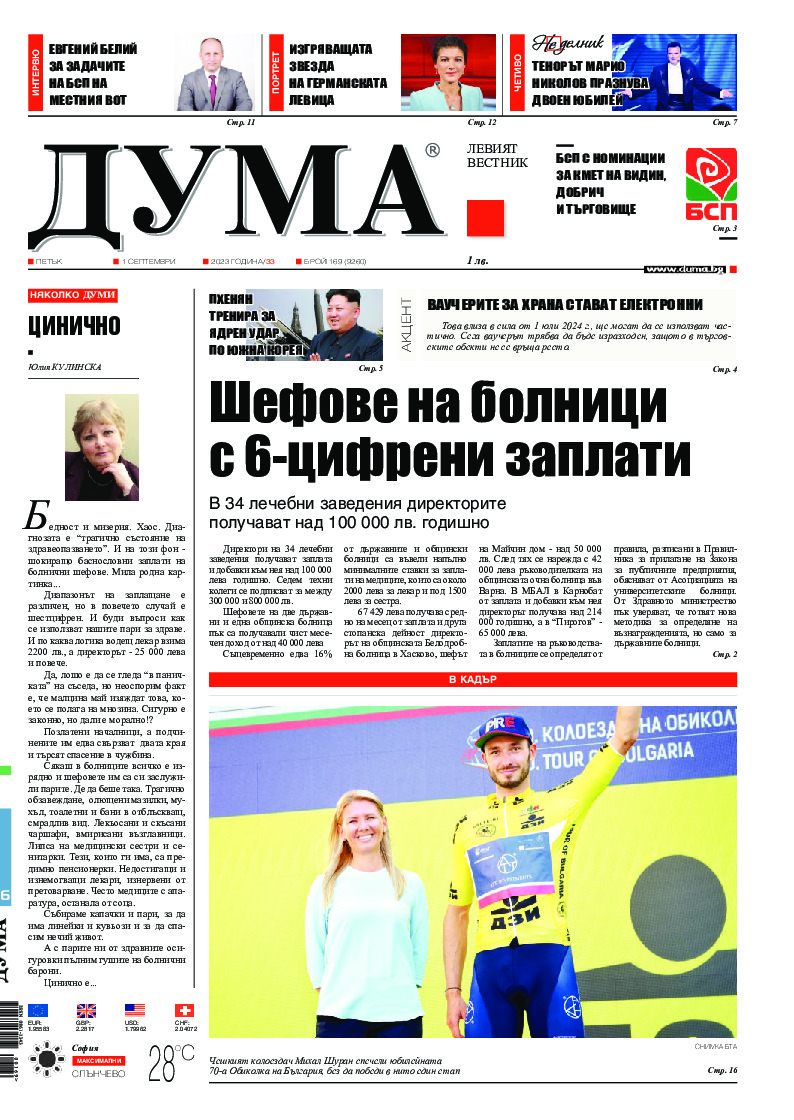 АБОНАМЕНТ за вестник „ДУМА“ за 2026 година. Можете да се абонирате в: „Български пощи“ АД до 15 декември 2025 г., „Доби прес“ ЕООД до 28 декември 2025 г., в редакцията на вестника до 20 декември 2025 г. Каталожен номер 6. Цени: 12 месеца - 149 € / 291,42 лв., 6 месеца - 75 € / 146,69 лв., 3 месеца - 40 € / 78,23 лв., 1 месец - 14 € / 27,38 лв. За повече информация тел. 02 9705 203 и 02 9705 216 отдел „Разпространение” на в-к ДУМА на ул. „Позитано” 20 А. E-mail: abonament@duma.bg АБОНАМЕНТ за вестник „ДУМА“ за 2026 година. Можете да се абонирате в: „Български пощи“ АД до 15 декември 2025 г., „Доби прес“ ЕООД до 28 декември 2025 г., в редакцията на вестника до 20 декември 2025 г. Каталожен номер 6. Цени: 12 месеца - 149 € / 291,42 лв., 6 месеца - 75 € / 146,69 лв., 3 месеца - 40 € / 78,23 лв., 1 месец - 14 € / 27,38 лв. За повече информация тел. 02 9705 203 и 02 9705 216 отдел „Разпространение” на в-к ДУМА на ул. „Позитано” 20 А. E-mail: abonament@duma.bg
