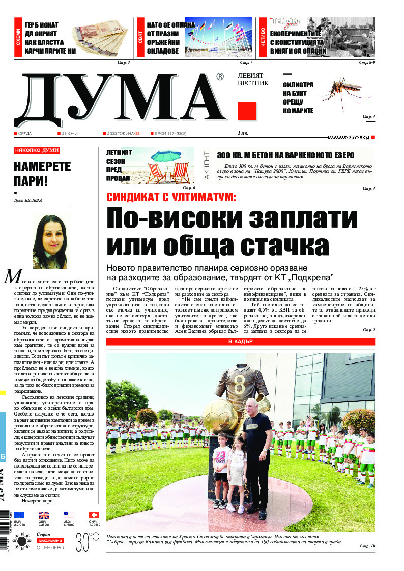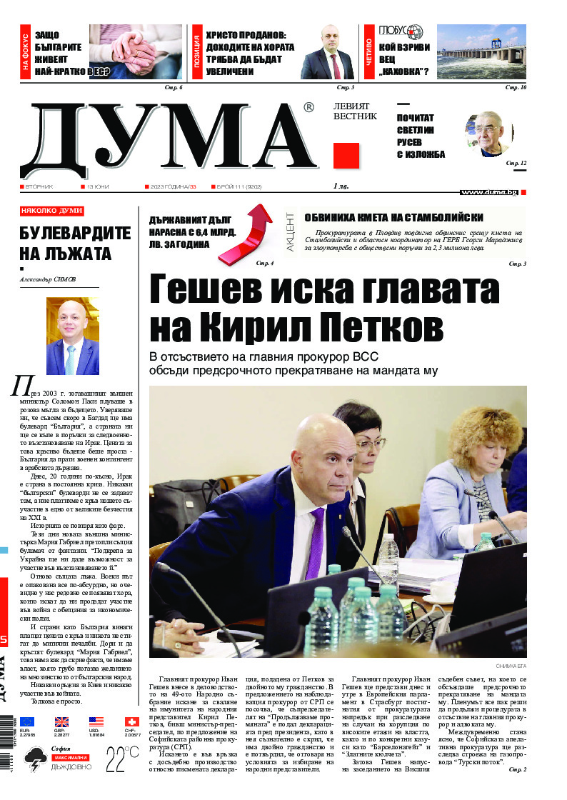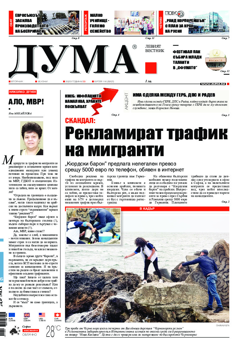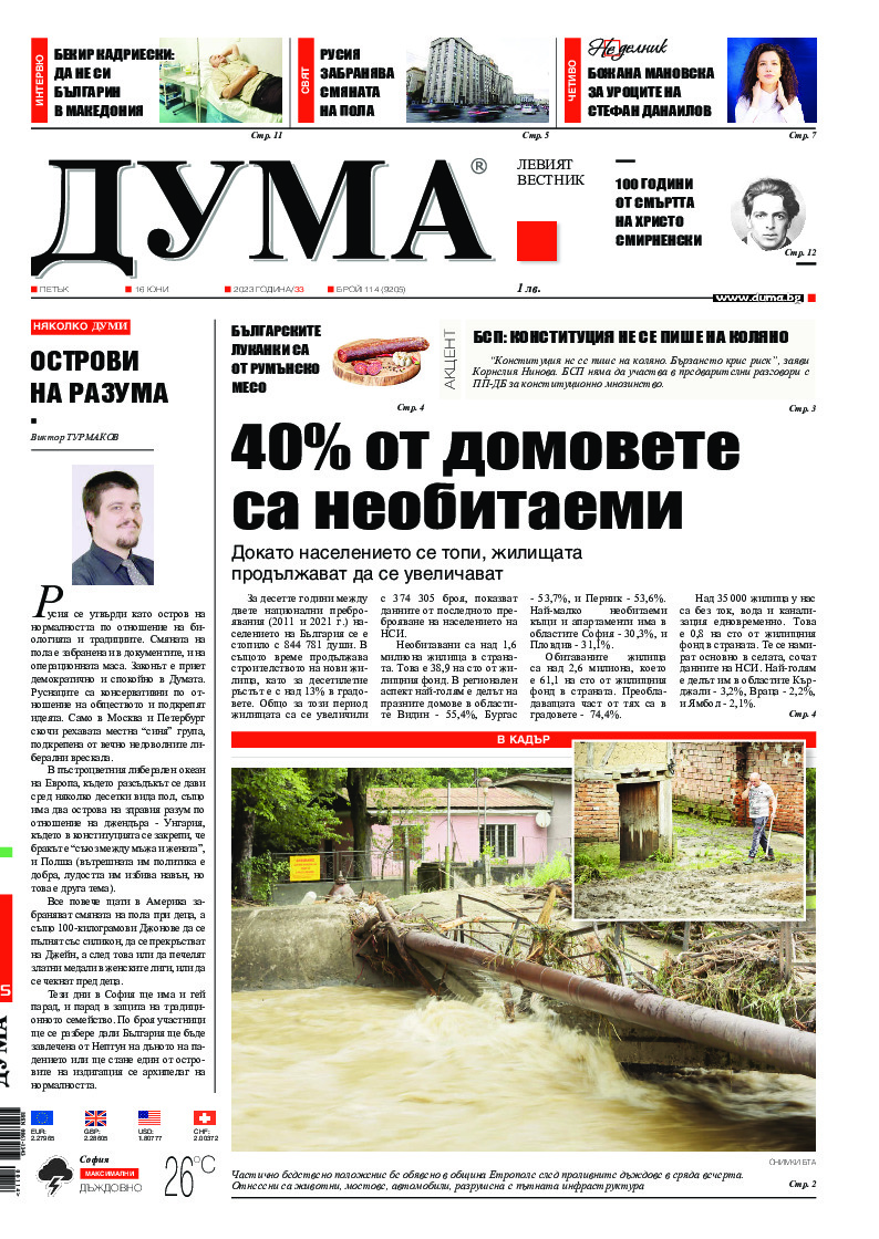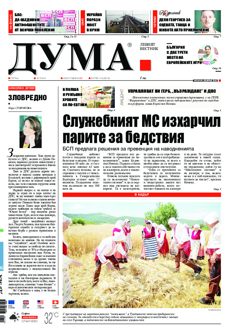 АБОНАМЕНТ за вестник „ДУМА“ за 2026 година. Можете да се абонирате в: „Български пощи“ АД до 15 декември 2025 г., „Доби прес“ ЕООД до 28 декември 2025 г., в редакцията на вестника до 20 декември 2025 г. Каталожен номер 6. Цени: 12 месеца - 149 € / 291,42 лв., 6 месеца - 75 € / 146,69 лв., 3 месеца - 40 € / 78,23 лв., 1 месец - 14 € / 27,38 лв. За повече информация тел. 02 9705 203 и 02 9705 216 отдел „Разпространение” на в-к ДУМА на ул. „Позитано” 20 А. E-mail: abonament@duma.bg АБОНАМЕНТ за вестник „ДУМА“ за 2026 година. Можете да се абонирате в: „Български пощи“ АД до 15 декември 2025 г., „Доби прес“ ЕООД до 28 декември 2025 г., в редакцията на вестника до 20 декември 2025 г. Каталожен номер 6. Цени: 12 месеца - 149 € / 291,42 лв., 6 месеца - 75 € / 146,69 лв., 3 месеца - 40 € / 78,23 лв., 1 месец - 14 € / 27,38 лв. За повече информация тел. 02 9705 203 и 02 9705 216 отдел „Разпространение” на в-к ДУМА на ул. „Позитано” 20 А. E-mail: abonament@duma.bg