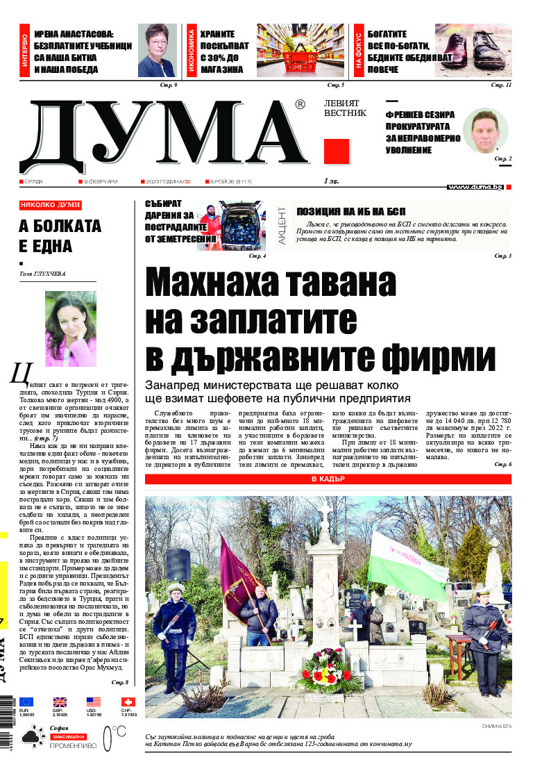 АБОНАМЕНТ за вестник „ДУМА“ за 2026 година. Можете да се абонирате в: „Български пощи“ АД до 15 декември 2025 г., „Доби прес“ ЕООД до 28 декември 2025 г., в редакцията на вестника до 20 декември 2025 г. Каталожен номер 6. Цени: 12 месеца - 149 € / 291,42 лв., 6 месеца - 75 € / 146,69 лв., 3 месеца - 40 € / 78,23 лв., 1 месец - 14 € / 27,38 лв. За повече информация тел. 02 9705 203 и 02 9705 216 отдел „Разпространение” на в-к ДУМА на ул. „Позитано” 20 А. E-mail: abonament@duma.bg АБОНАМЕНТ за вестник „ДУМА“ за 2026 година. Можете да се абонирате в: „Български пощи“ АД до 15 декември 2025 г., „Доби прес“ ЕООД до 28 декември 2025 г., в редакцията на вестника до 20 декември 2025 г. Каталожен номер 6. Цени: 12 месеца - 149 € / 291,42 лв., 6 месеца - 75 € / 146,69 лв., 3 месеца - 40 € / 78,23 лв., 1 месец - 14 € / 27,38 лв. За повече информация тел. 02 9705 203 и 02 9705 216 отдел „Разпространение” на в-к ДУМА на ул. „Позитано” 20 А. E-mail: abonament@duma.bg