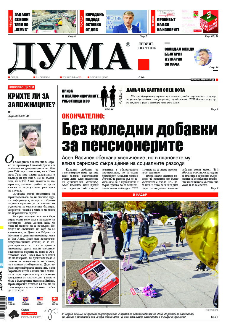 АБОНАМЕНТ за вестник „ДУМА“ за 2026 година. Можете да се абонирате в: „Български пощи“ АД до 15 декември 2025 г., „Доби прес“ ЕООД до 28 декември 2025 г., в редакцията на вестника до 20 декември 2025 г. Каталожен номер 6. Цени: 12 месеца - 149 € / 291,42 лв., 6 месеца - 75 € / 146,69 лв., 3 месеца - 40 € / 78,23 лв., 1 месец - 14 € / 27,38 лв. За повече информация тел. 02 9705 203 и 02 9705 216 отдел „Разпространение” на в-к ДУМА на ул. „Позитано” 20 А. E-mail: abonament@duma.bg АБОНАМЕНТ за вестник „ДУМА“ за 2026 година. Можете да се абонирате в: „Български пощи“ АД до 15 декември 2025 г., „Доби прес“ ЕООД до 28 декември 2025 г., в редакцията на вестника до 20 декември 2025 г. Каталожен номер 6. Цени: 12 месеца - 149 € / 291,42 лв., 6 месеца - 75 € / 146,69 лв., 3 месеца - 40 € / 78,23 лв., 1 месец - 14 € / 27,38 лв. За повече информация тел. 02 9705 203 и 02 9705 216 отдел „Разпространение” на в-к ДУМА на ул. „Позитано” 20 А. E-mail: abonament@duma.bg