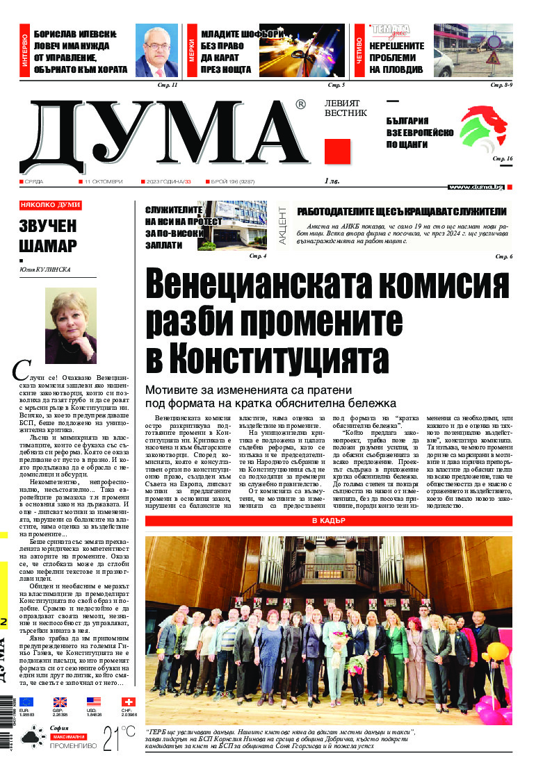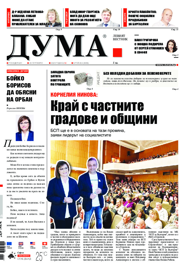 АБОНАМЕНТ за вестник „ДУМА“ за 2026 година. Можете да се абонирате в: „Български пощи“ АД до 15 декември 2025 г., „Доби прес“ ЕООД до 28 декември 2025 г., в редакцията на вестника до 20 декември 2025 г. Каталожен номер 6. Цени: 12 месеца - 149 € / 291,42 лв., 6 месеца - 75 € / 146,69 лв., 3 месеца - 40 € / 78,23 лв., 1 месец - 14 € / 27,38 лв. За повече информация тел. 02 9705 203 и 02 9705 216 отдел „Разпространение” на в-к ДУМА на ул. „Позитано” 20 А. E-mail: abonament@duma.bg АБОНАМЕНТ за вестник „ДУМА“ за 2026 година. Можете да се абонирате в: „Български пощи“ АД до 15 декември 2025 г., „Доби прес“ ЕООД до 28 декември 2025 г., в редакцията на вестника до 20 декември 2025 г. Каталожен номер 6. Цени: 12 месеца - 149 € / 291,42 лв., 6 месеца - 75 € / 146,69 лв., 3 месеца - 40 € / 78,23 лв., 1 месец - 14 € / 27,38 лв. За повече информация тел. 02 9705 203 и 02 9705 216 отдел „Разпространение” на в-к ДУМА на ул. „Позитано” 20 А. E-mail: abonament@duma.bg