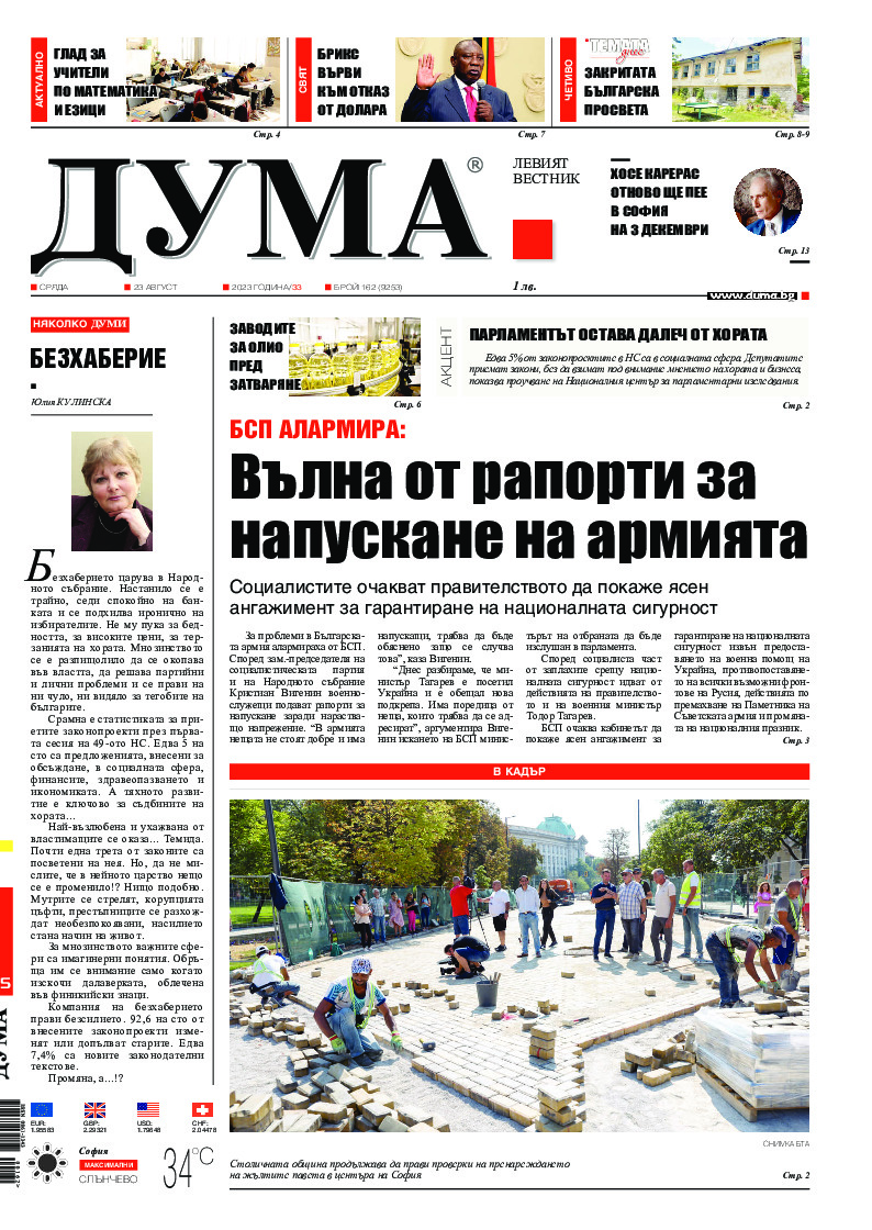 АБОНАМЕНТ за вестник „ДУМА“ за 2026 година. Можете да се абонирате в: „Български пощи“ АД до 15 декември 2025 г., „Доби прес“ ЕООД до 28 декември 2025 г., в редакцията на вестника до 20 декември 2025 г. Каталожен номер 6. Цени: 12 месеца - 149 € / 291,42 лв., 6 месеца - 75 € / 146,69 лв., 3 месеца - 40 € / 78,23 лв., 1 месец - 14 € / 27,38 лв. За повече информация тел. 02 9705 203 и 02 9705 216 отдел „Разпространение” на в-к ДУМА на ул. „Позитано” 20 А. E-mail: abonament@duma.bg АБОНАМЕНТ за вестник „ДУМА“ за 2026 година. Можете да се абонирате в: „Български пощи“ АД до 15 декември 2025 г., „Доби прес“ ЕООД до 28 декември 2025 г., в редакцията на вестника до 20 декември 2025 г. Каталожен номер 6. Цени: 12 месеца - 149 € / 291,42 лв., 6 месеца - 75 € / 146,69 лв., 3 месеца - 40 € / 78,23 лв., 1 месец - 14 € / 27,38 лв. За повече информация тел. 02 9705 203 и 02 9705 216 отдел „Разпространение” на в-к ДУМА на ул. „Позитано” 20 А. E-mail: abonament@duma.bg