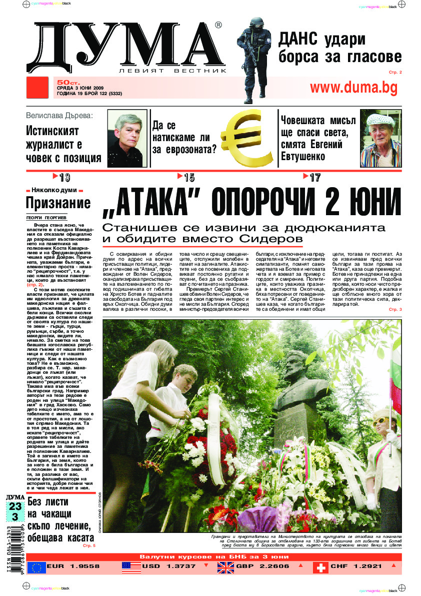 АБОНАМЕНТ за вестник „ДУМА“ за 2026 година. Можете да се абонирате в: „Български пощи“ АД до 15 декември 2025 г., „Доби прес“ ЕООД до 28 декември 2025 г., в редакцията на вестника до 20 декември 2025 г. Каталожен номер 6. Цени: 12 месеца - 149 € / 291,42 лв., 6 месеца - 75 € / 146,69 лв., 3 месеца - 40 € / 78,23 лв., 1 месец - 14 € / 27,38 лв. За повече информация тел. 02 9705 203 и 02 9705 216 отдел „Разпространение” на в-к ДУМА на ул. „Позитано” 20 А. E-mail: abonament@duma.bg АБОНАМЕНТ за вестник „ДУМА“ за 2026 година. Можете да се абонирате в: „Български пощи“ АД до 15 декември 2025 г., „Доби прес“ ЕООД до 28 декември 2025 г., в редакцията на вестника до 20 декември 2025 г. Каталожен номер 6. Цени: 12 месеца - 149 € / 291,42 лв., 6 месеца - 75 € / 146,69 лв., 3 месеца - 40 € / 78,23 лв., 1 месец - 14 € / 27,38 лв. За повече информация тел. 02 9705 203 и 02 9705 216 отдел „Разпространение” на в-к ДУМА на ул. „Позитано” 20 А. E-mail: abonament@duma.bg