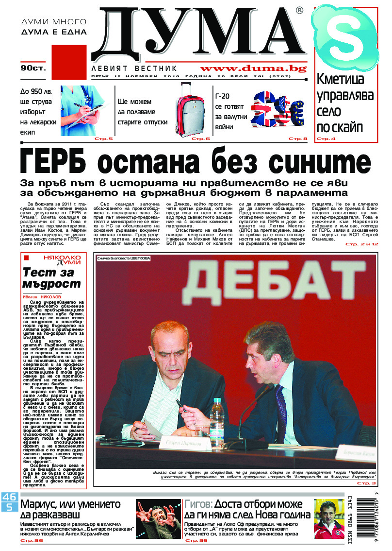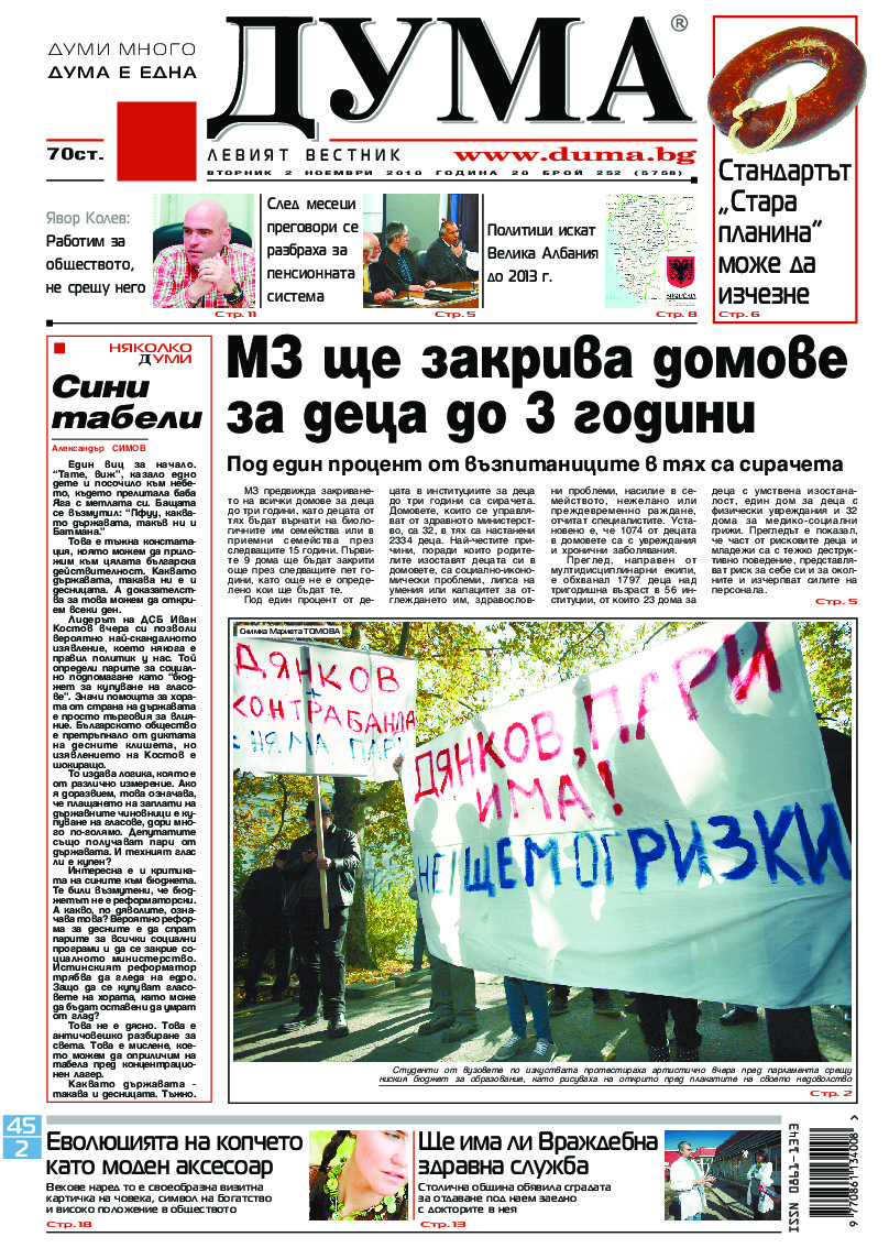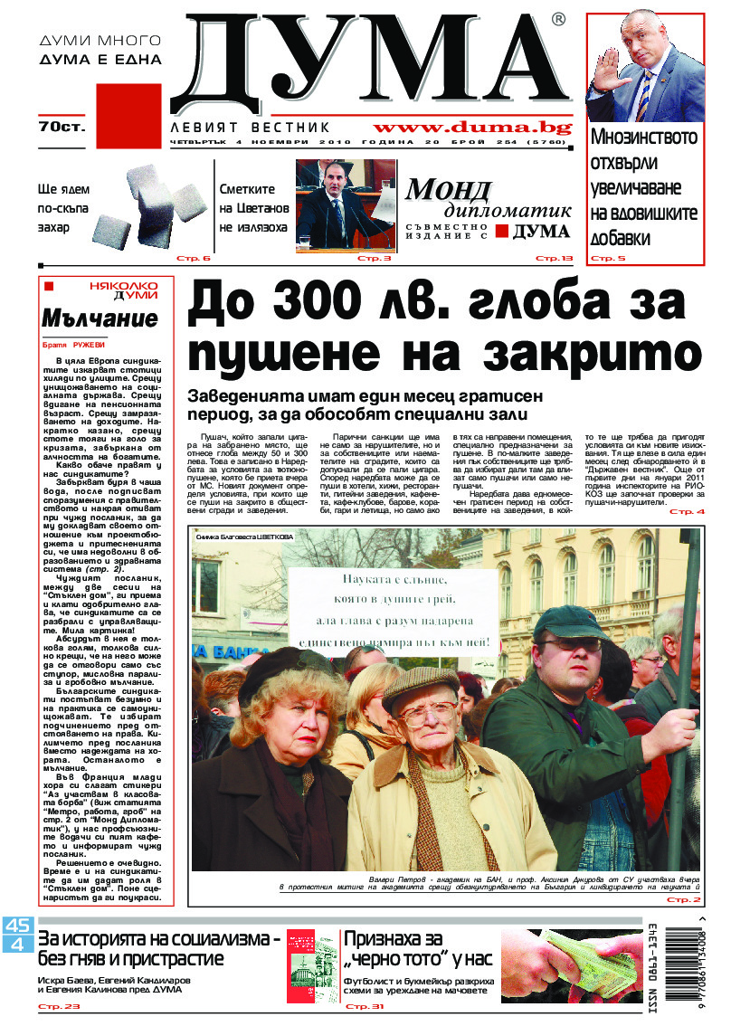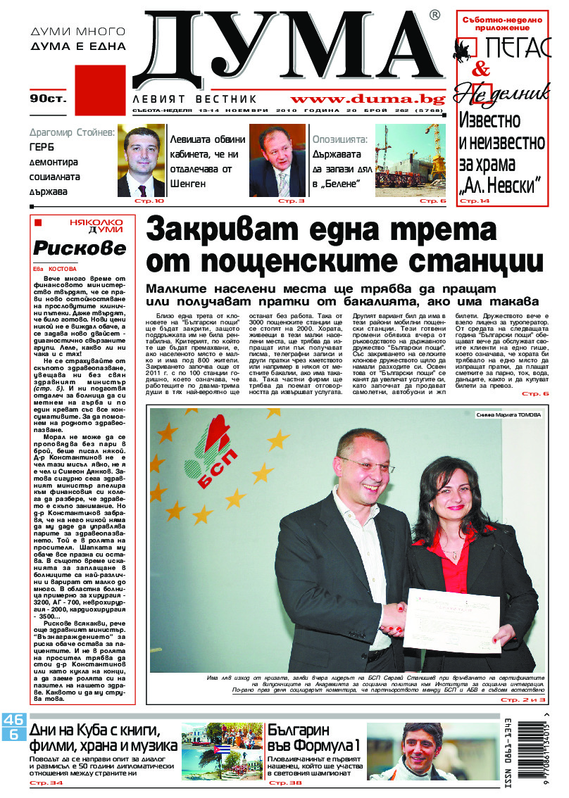 АБОНАМЕНТ за вестник „ДУМА“ за 2026 година. Можете да се абонирате в: „Български пощи“ АД до 15 декември 2025 г., „Доби прес“ ЕООД до 28 декември 2025 г., в редакцията на вестника до 20 декември 2025 г. Каталожен номер 6. Цени: 12 месеца - 149 € / 291,42 лв., 6 месеца - 75 € / 146,69 лв., 3 месеца - 40 € / 78,23 лв., 1 месец - 14 € / 27,38 лв. За повече информация тел. 02 9705 203 и 02 9705 216 отдел „Разпространение” на в-к ДУМА на ул. „Позитано” 20 А. E-mail: abonament@duma.bg АБОНАМЕНТ за вестник „ДУМА“ за 2026 година. Можете да се абонирате в: „Български пощи“ АД до 15 декември 2025 г., „Доби прес“ ЕООД до 28 декември 2025 г., в редакцията на вестника до 20 декември 2025 г. Каталожен номер 6. Цени: 12 месеца - 149 € / 291,42 лв., 6 месеца - 75 € / 146,69 лв., 3 месеца - 40 € / 78,23 лв., 1 месец - 14 € / 27,38 лв. За повече информация тел. 02 9705 203 и 02 9705 216 отдел „Разпространение” на в-к ДУМА на ул. „Позитано” 20 А. E-mail: abonament@duma.bg