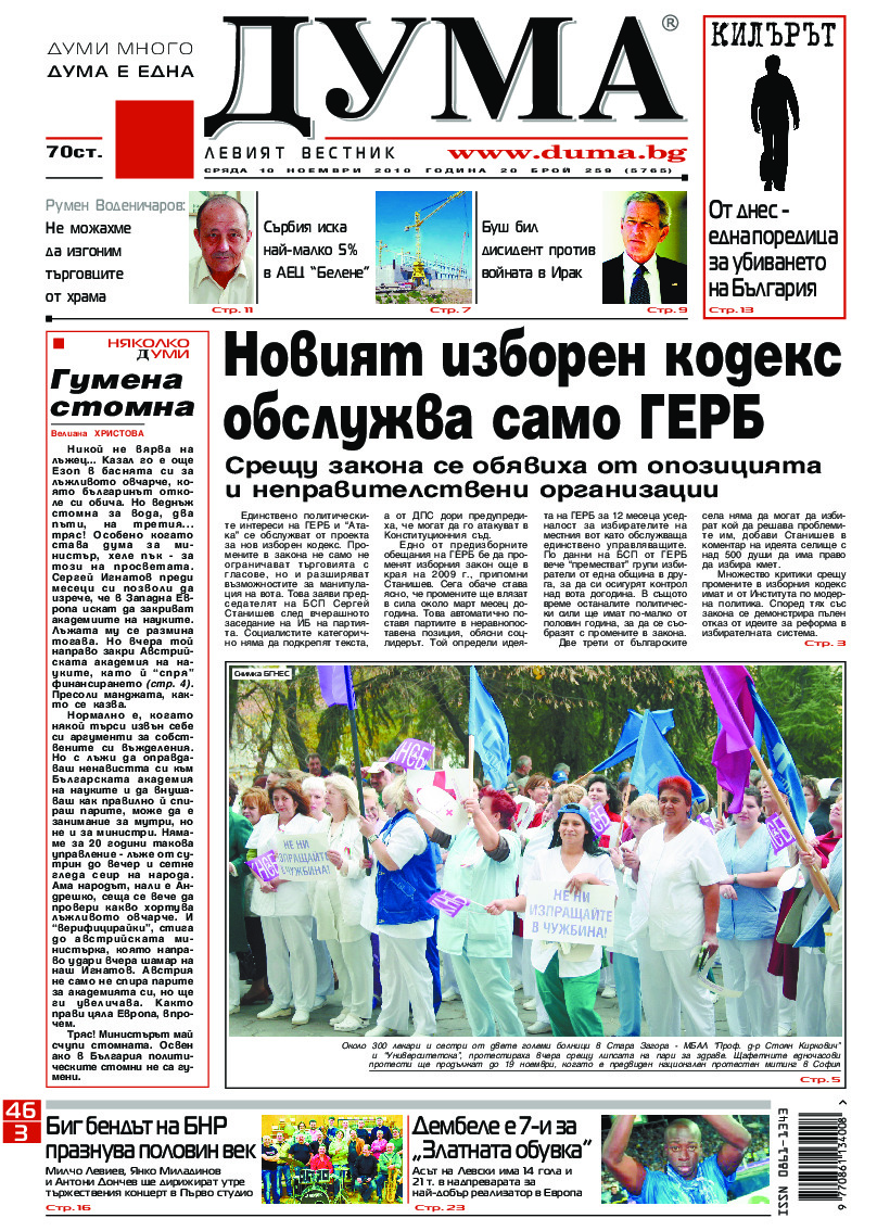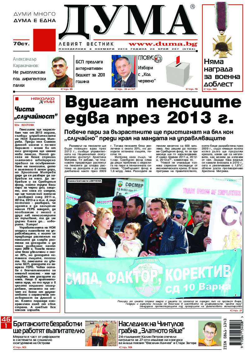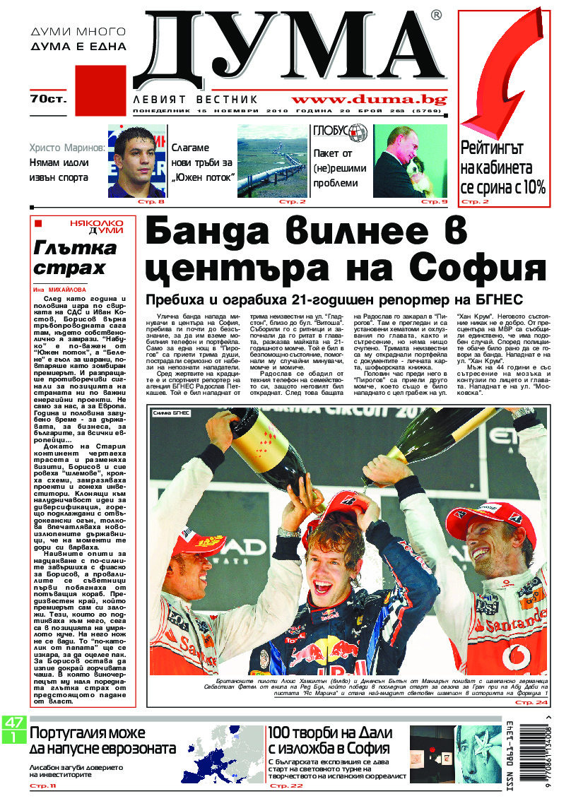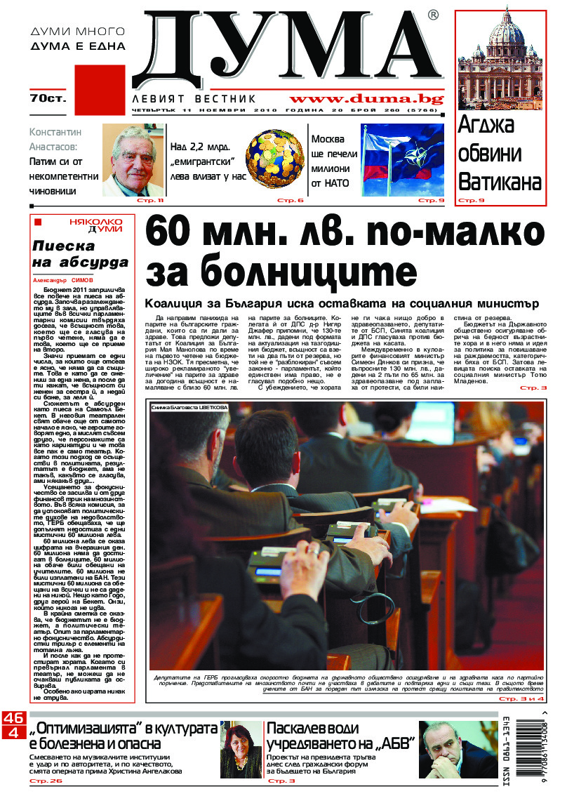 АБОНАМЕНТ за вестник „ДУМА“ за 2026 година. Можете да се абонирате в: „Български пощи“ АД до 15 декември 2025 г., „Доби прес“ ЕООД до 28 декември 2025 г., в редакцията на вестника до 20 декември 2025 г. Каталожен номер 6. Цени: 12 месеца - 149 € / 291,42 лв., 6 месеца - 75 € / 146,69 лв., 3 месеца - 40 € / 78,23 лв., 1 месец - 14 € / 27,38 лв. За повече информация тел. 02 9705 203 и 02 9705 216 отдел „Разпространение” на в-к ДУМА на ул. „Позитано” 20 А. E-mail: abonament@duma.bg АБОНАМЕНТ за вестник „ДУМА“ за 2026 година. Можете да се абонирате в: „Български пощи“ АД до 15 декември 2025 г., „Доби прес“ ЕООД до 28 декември 2025 г., в редакцията на вестника до 20 декември 2025 г. Каталожен номер 6. Цени: 12 месеца - 149 € / 291,42 лв., 6 месеца - 75 € / 146,69 лв., 3 месеца - 40 € / 78,23 лв., 1 месец - 14 € / 27,38 лв. За повече информация тел. 02 9705 203 и 02 9705 216 отдел „Разпространение” на в-к ДУМА на ул. „Позитано” 20 А. E-mail: abonament@duma.bg