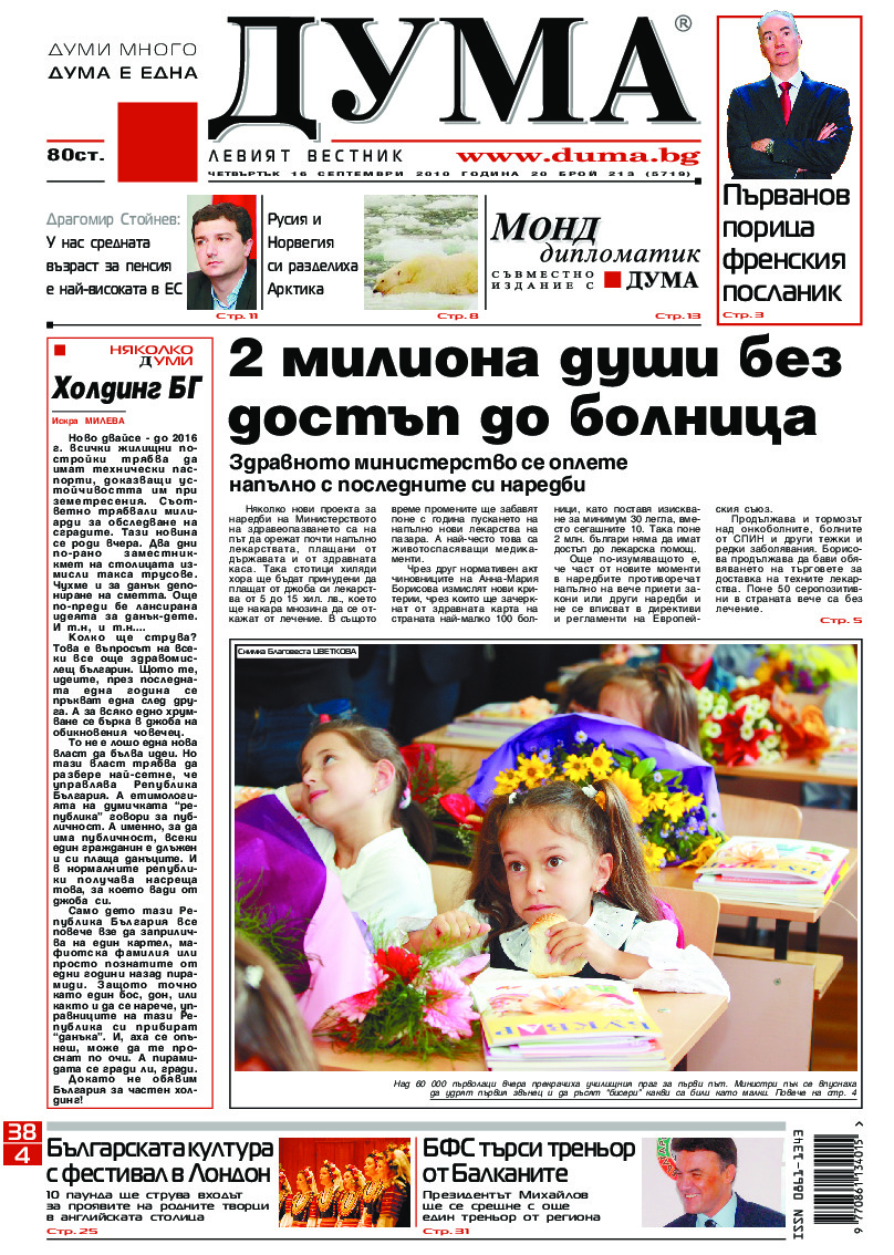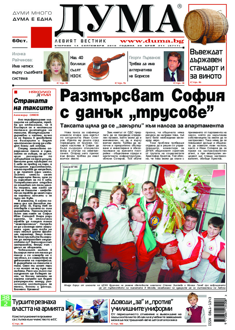 АБОНАМЕНТ за вестник „ДУМА“ за 2026 година. Можете да се абонирате в: „Български пощи“ АД до 15 декември 2025 г., „Доби прес“ ЕООД до 28 декември 2025 г., в редакцията на вестника до 20 декември 2025 г. Каталожен номер 6. Цени: 12 месеца - 149 € / 291,42 лв., 6 месеца - 75 € / 146,69 лв., 3 месеца - 40 € / 78,23 лв., 1 месец - 14 € / 27,38 лв. За повече информация тел. 02 9705 203 и 02 9705 216 отдел „Разпространение” на в-к ДУМА на ул. „Позитано” 20 А. E-mail: abonament@duma.bg АБОНАМЕНТ за вестник „ДУМА“ за 2026 година. Можете да се абонирате в: „Български пощи“ АД до 15 декември 2025 г., „Доби прес“ ЕООД до 28 декември 2025 г., в редакцията на вестника до 20 декември 2025 г. Каталожен номер 6. Цени: 12 месеца - 149 € / 291,42 лв., 6 месеца - 75 € / 146,69 лв., 3 месеца - 40 € / 78,23 лв., 1 месец - 14 € / 27,38 лв. За повече информация тел. 02 9705 203 и 02 9705 216 отдел „Разпространение” на в-к ДУМА на ул. „Позитано” 20 А. E-mail: abonament@duma.bg