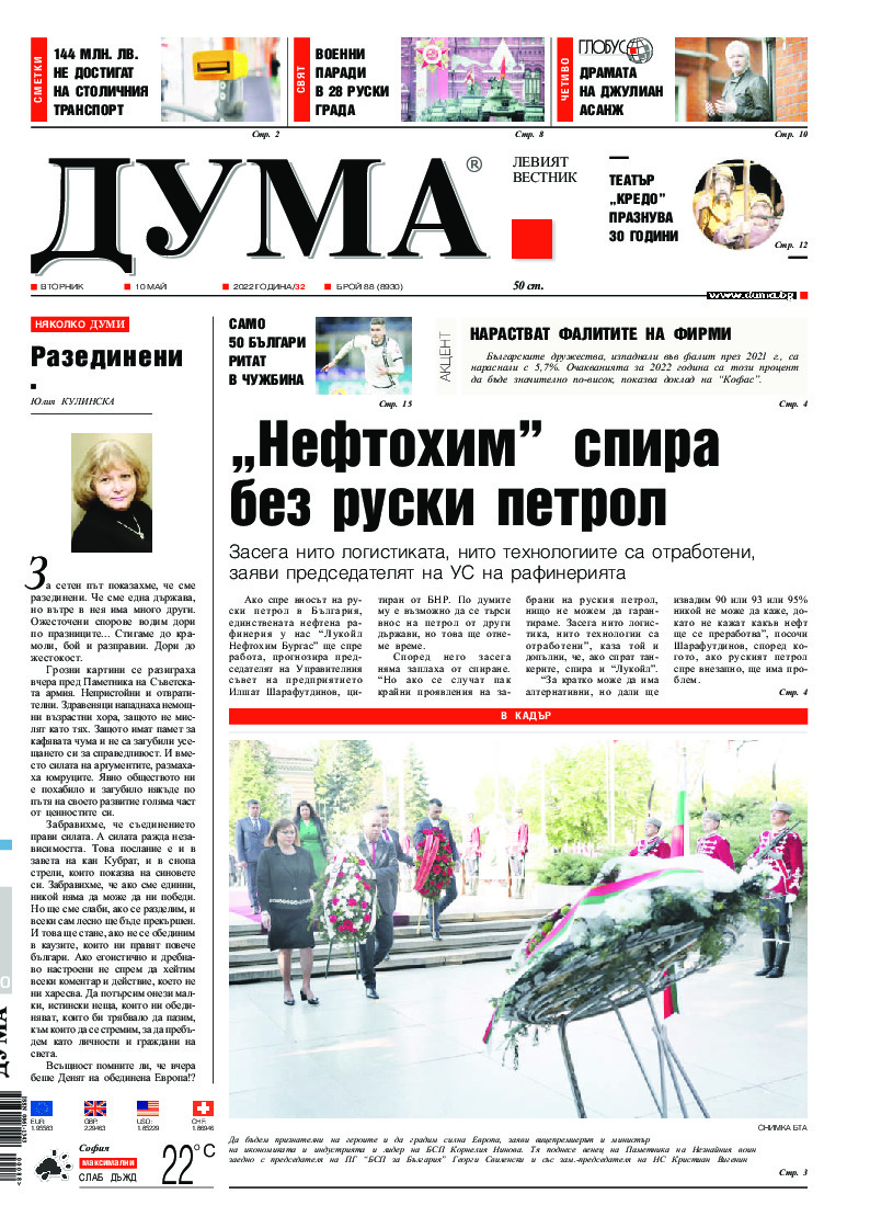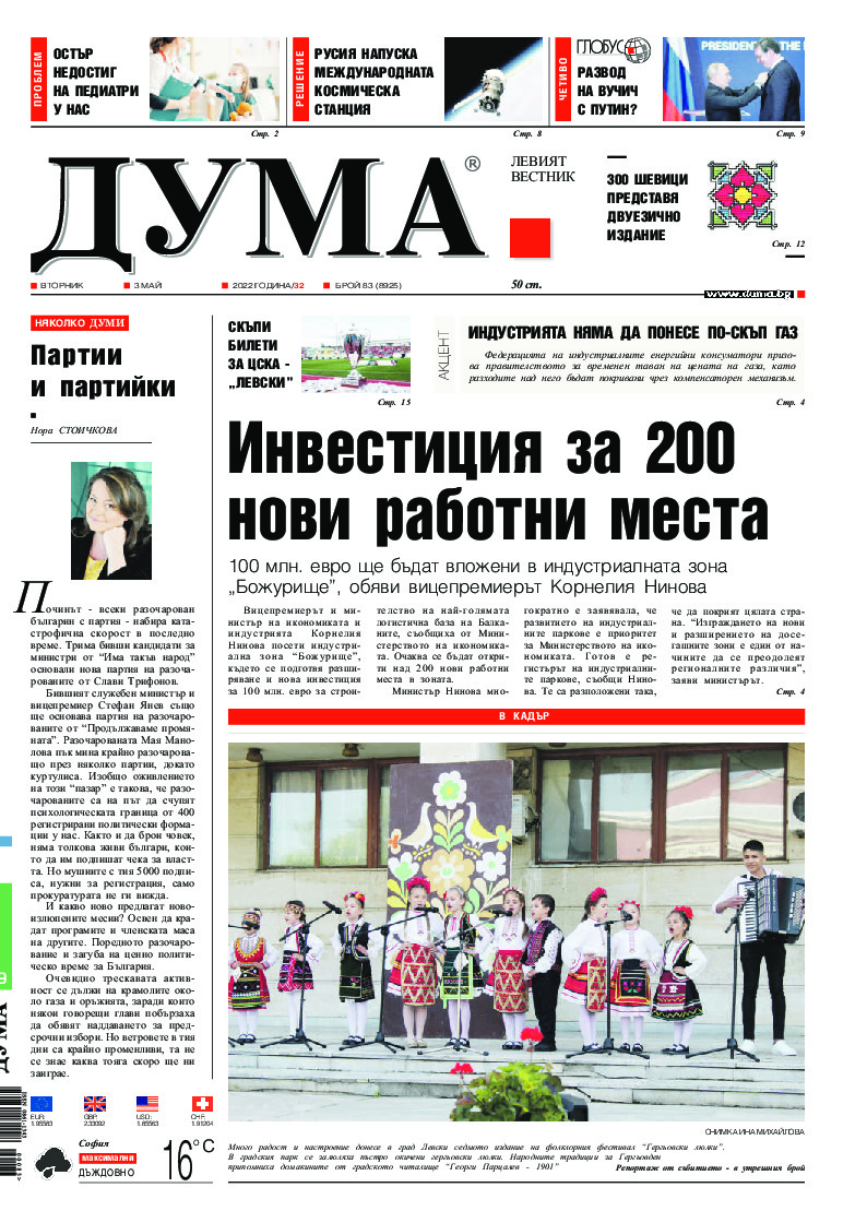 АБОНАМЕНТ за вестник „ДУМА“ за 2026 година. Можете да се абонирате в: „Български пощи“ АД до 15 декември 2025 г., „Доби прес“ ЕООД до 28 декември 2025 г., в редакцията на вестника до 20 декември 2025 г. Каталожен номер 6. Цени: 12 месеца - 149 € / 291,42 лв., 6 месеца - 75 € / 146,69 лв., 3 месеца - 40 € / 78,23 лв., 1 месец - 14 € / 27,38 лв. За повече информация тел. 02 9705 203 и 02 9705 216 отдел „Разпространение” на в-к ДУМА на ул. „Позитано” 20 А. E-mail: abonament@duma.bg АБОНАМЕНТ за вестник „ДУМА“ за 2026 година. Можете да се абонирате в: „Български пощи“ АД до 15 декември 2025 г., „Доби прес“ ЕООД до 28 декември 2025 г., в редакцията на вестника до 20 декември 2025 г. Каталожен номер 6. Цени: 12 месеца - 149 € / 291,42 лв., 6 месеца - 75 € / 146,69 лв., 3 месеца - 40 € / 78,23 лв., 1 месец - 14 € / 27,38 лв. За повече информация тел. 02 9705 203 и 02 9705 216 отдел „Разпространение” на в-к ДУМА на ул. „Позитано” 20 А. E-mail: abonament@duma.bg