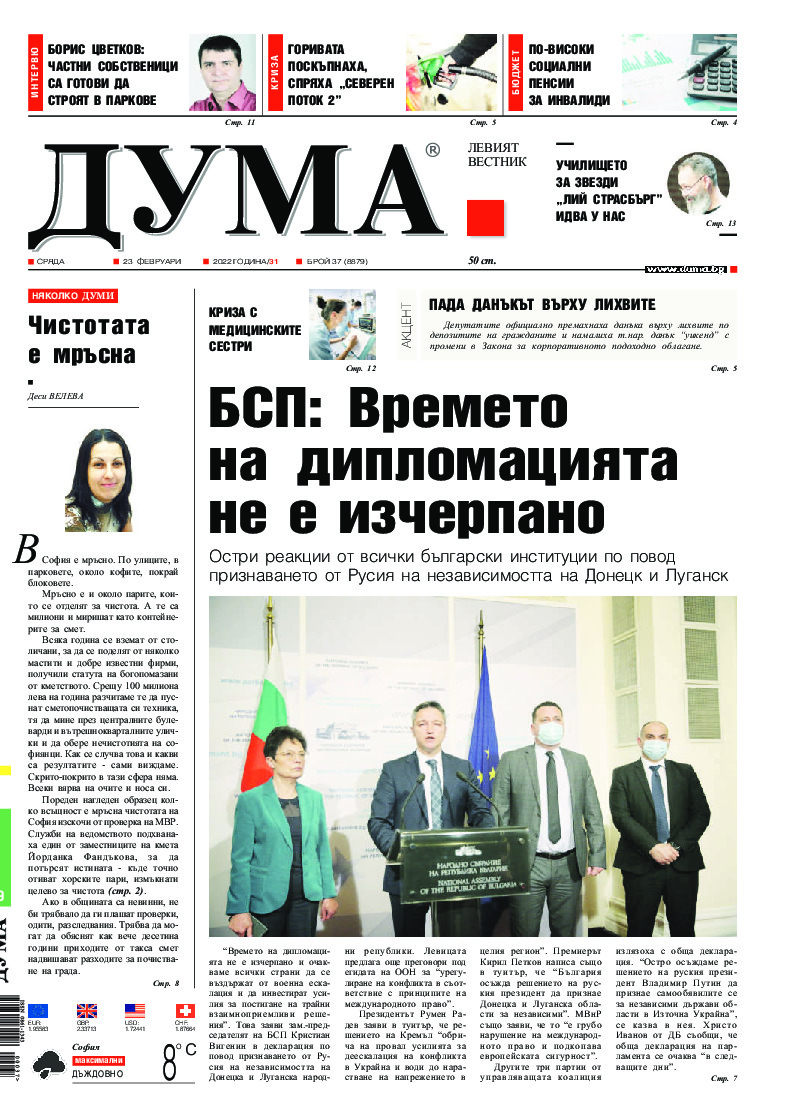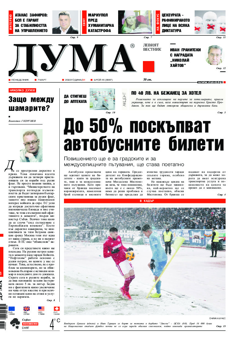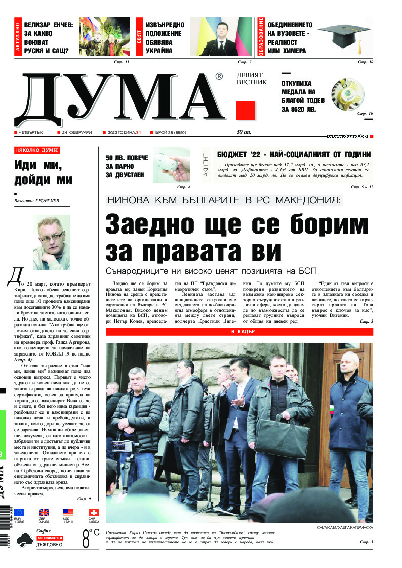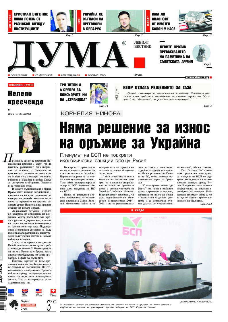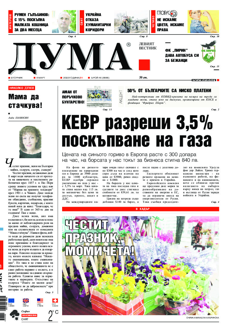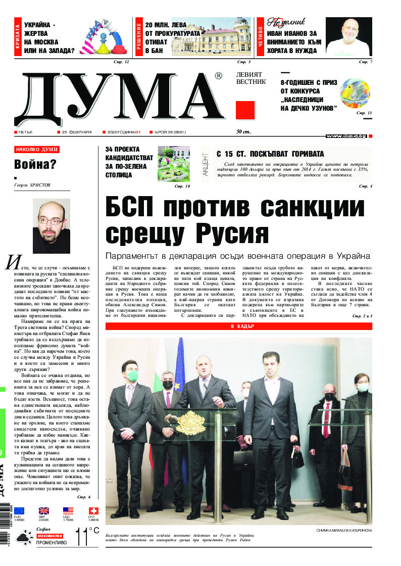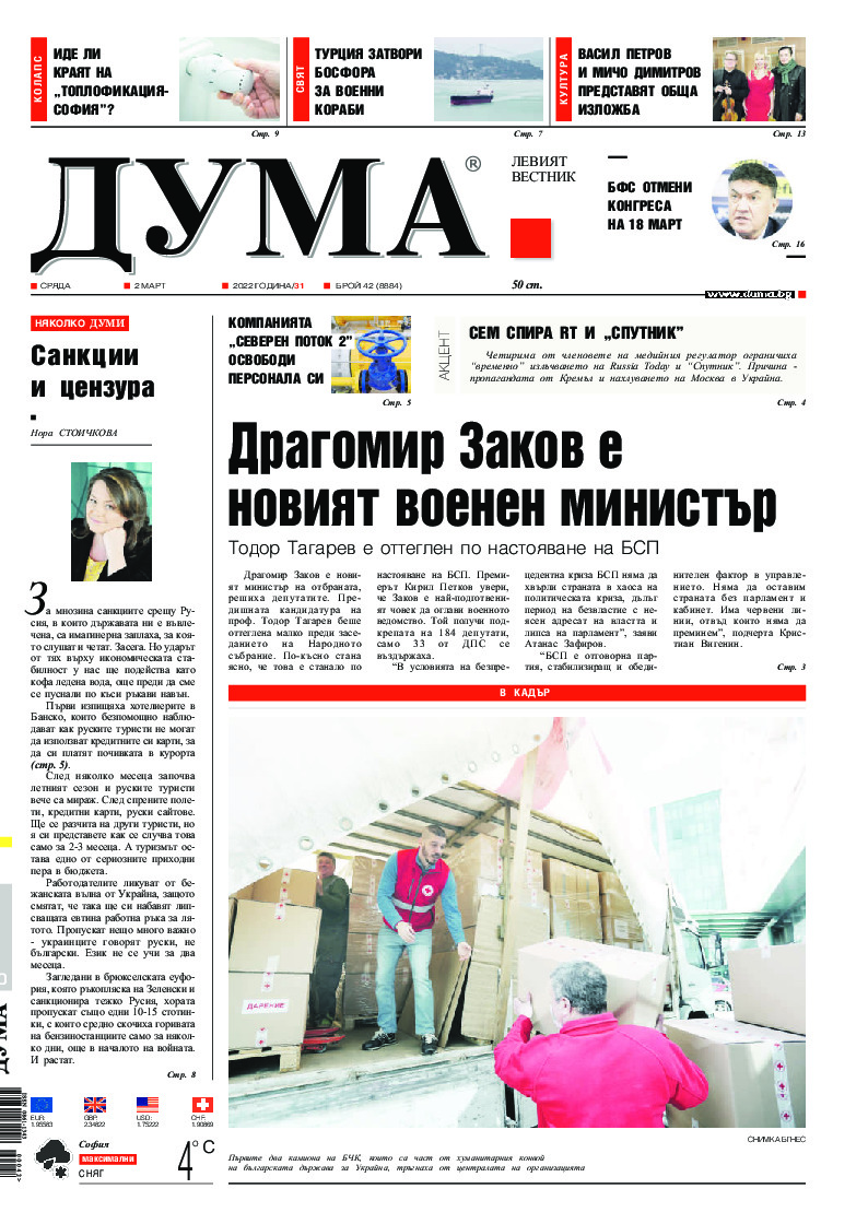АБОНАМЕНТ за вестник „ДУМА“ за 2026 година. Можете да се абонирате в: „Български пощи“ АД до 15 декември 2025 г., „Доби прес“ ЕООД до 28 декември 2025 г., в редакцията на вестника до 20 декември 2025 г. Каталожен номер 6. Цени: 12 месеца - 149 € / 291,42 лв., 6 месеца - 75 € / 146,69 лв., 3 месеца - 40 € / 78,23 лв., 1 месец - 14 € / 27,38 лв. За повече информация тел. 02 9705 203 и 02 9705 216 отдел „Разпространение” на в-к ДУМА на ул. „Позитано” 20 А. E-mail: abonament@duma.bg АБОНАМЕНТ за вестник „ДУМА“ за 2026 година. Можете да се абонирате в: „Български пощи“ АД до 15 декември 2025 г., „Доби прес“ ЕООД до 28 декември 2025 г., в редакцията на вестника до 20 декември 2025 г. Каталожен номер 6. Цени: 12 месеца - 149 € / 291,42 лв., 6 месеца - 75 € / 146,69 лв., 3 месеца - 40 € / 78,23 лв., 1 месец - 14 € / 27,38 лв. За повече информация тел. 02 9705 203 и 02 9705 216 отдел „Разпространение” на в-к ДУМА на ул. „Позитано” 20 А. E-mail: abonament@duma.bg