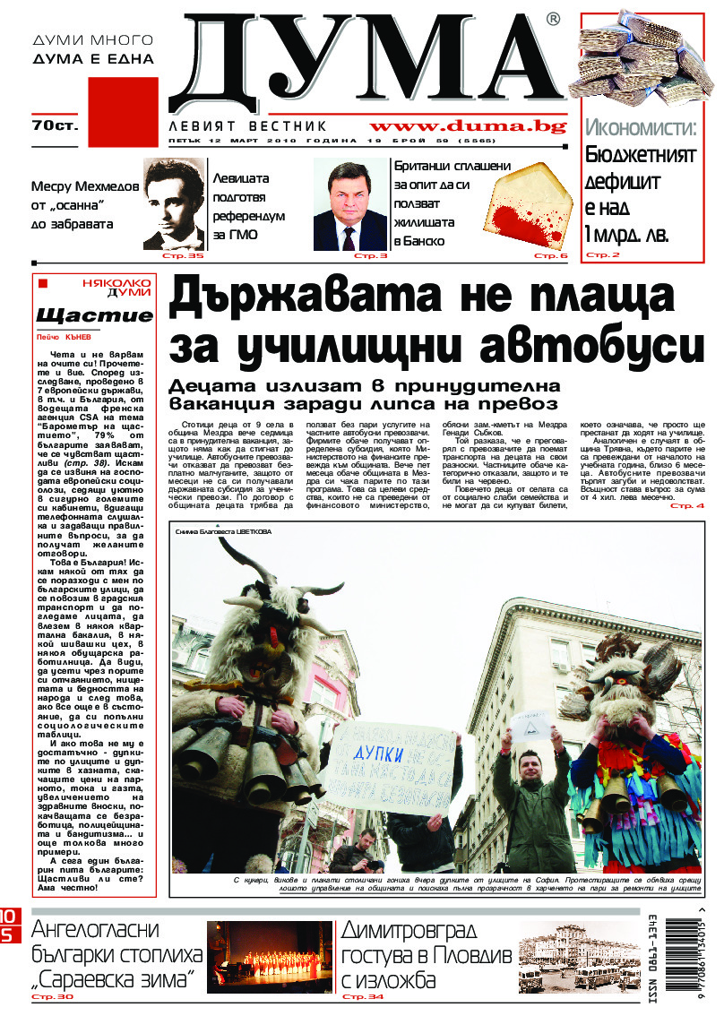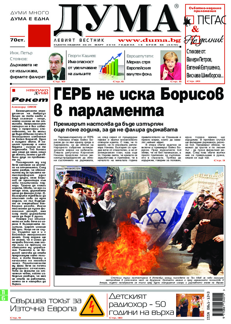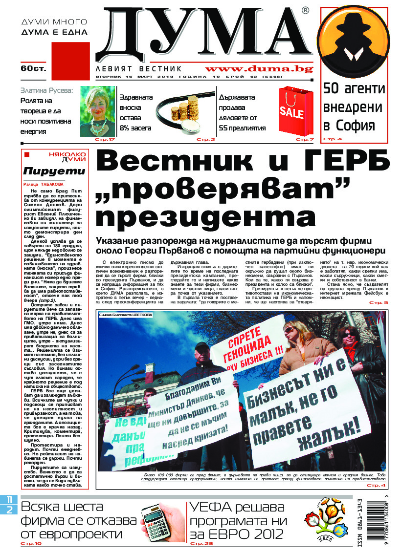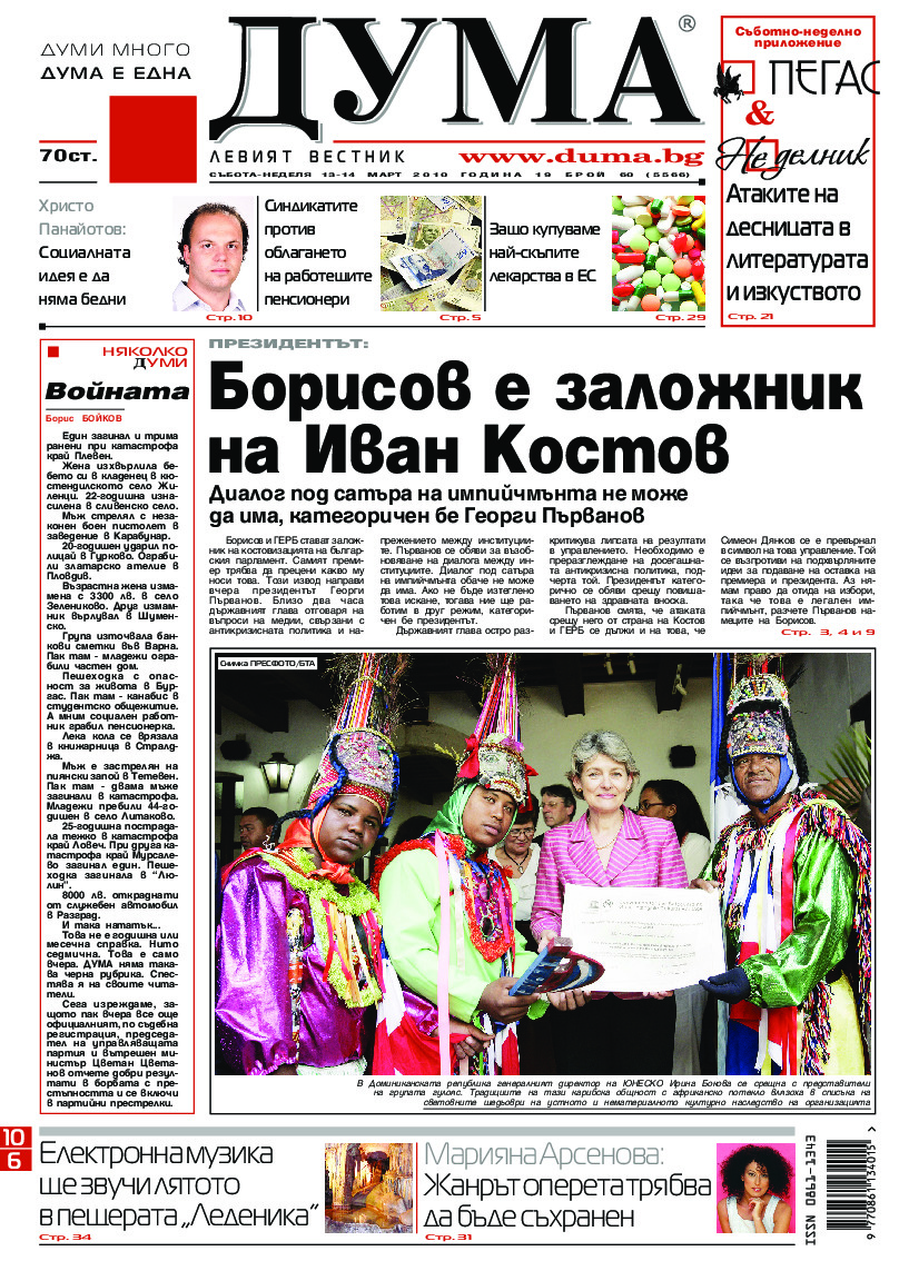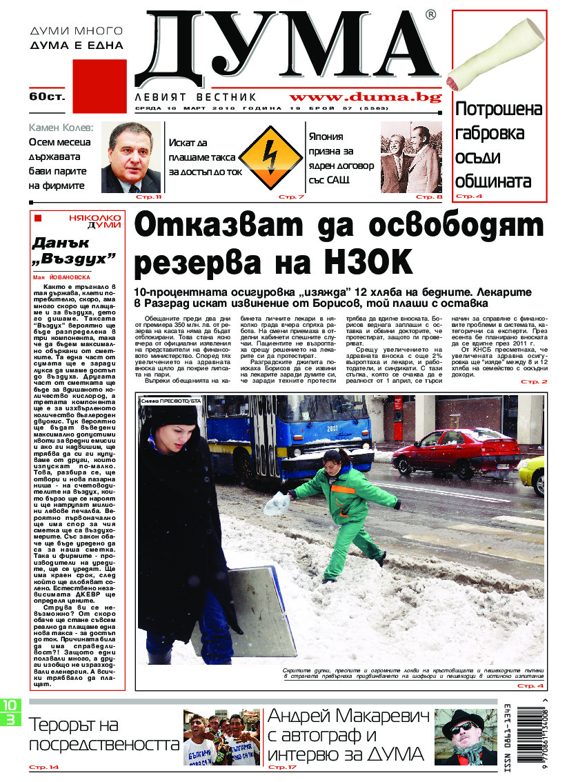 АБОНАМЕНТ за вестник „ДУМА“ за 2026 година. Можете да се абонирате в: „Български пощи“ АД до 15 декември 2025 г., „Доби прес“ ЕООД до 28 декември 2025 г., в редакцията на вестника до 20 декември 2025 г. Каталожен номер 6. Цени: 12 месеца - 149 € / 291,42 лв., 6 месеца - 75 € / 146,69 лв., 3 месеца - 40 € / 78,23 лв., 1 месец - 14 € / 27,38 лв. За повече информация тел. 02 9705 203 и 02 9705 216 отдел „Разпространение” на в-к ДУМА на ул. „Позитано” 20 А. E-mail: abonament@duma.bg АБОНАМЕНТ за вестник „ДУМА“ за 2026 година. Можете да се абонирате в: „Български пощи“ АД до 15 декември 2025 г., „Доби прес“ ЕООД до 28 декември 2025 г., в редакцията на вестника до 20 декември 2025 г. Каталожен номер 6. Цени: 12 месеца - 149 € / 291,42 лв., 6 месеца - 75 € / 146,69 лв., 3 месеца - 40 € / 78,23 лв., 1 месец - 14 € / 27,38 лв. За повече информация тел. 02 9705 203 и 02 9705 216 отдел „Разпространение” на в-к ДУМА на ул. „Позитано” 20 А. E-mail: abonament@duma.bg