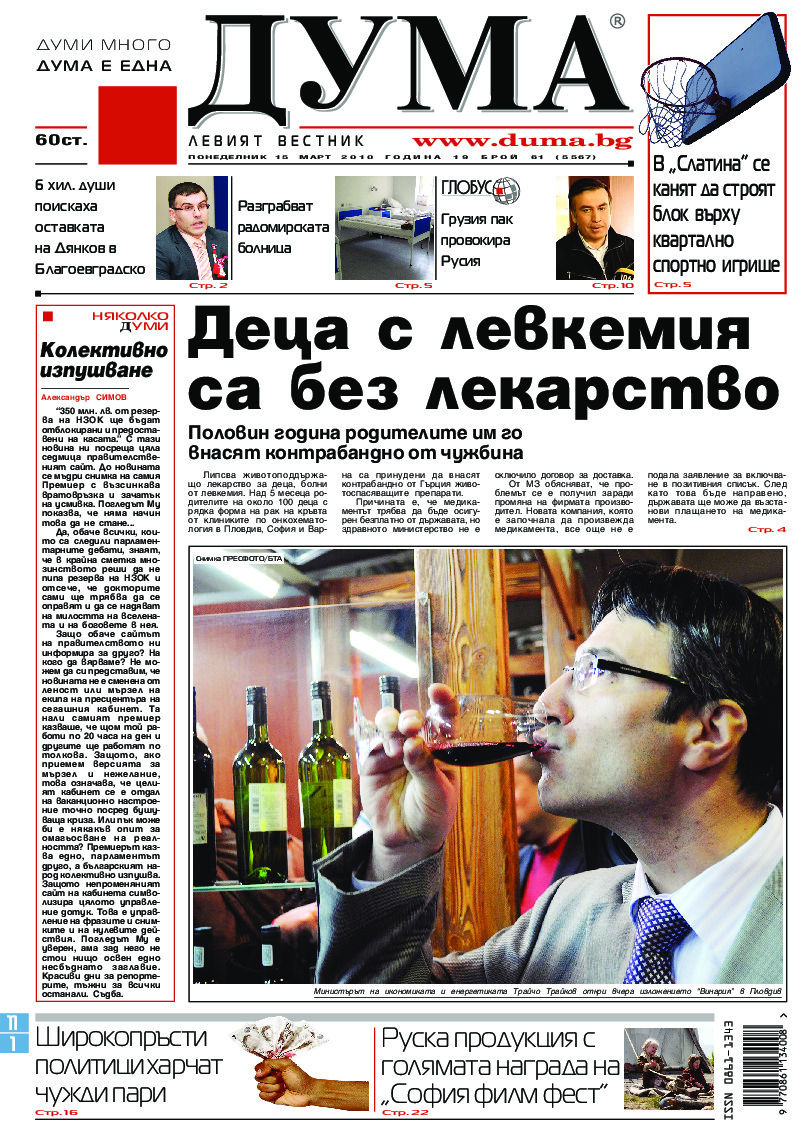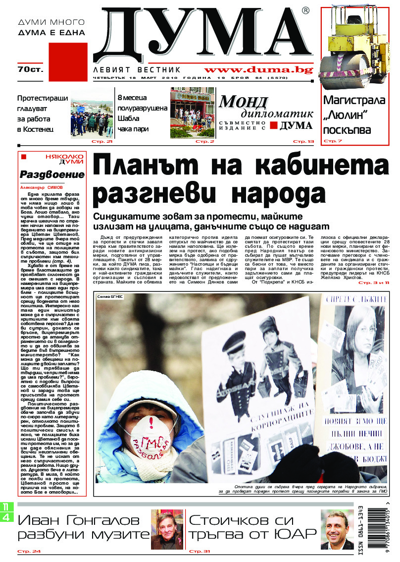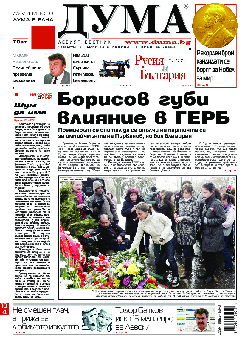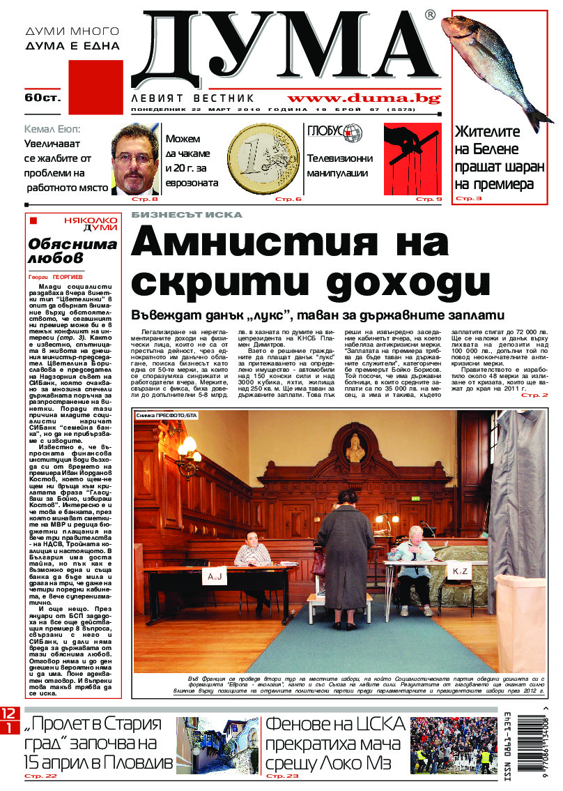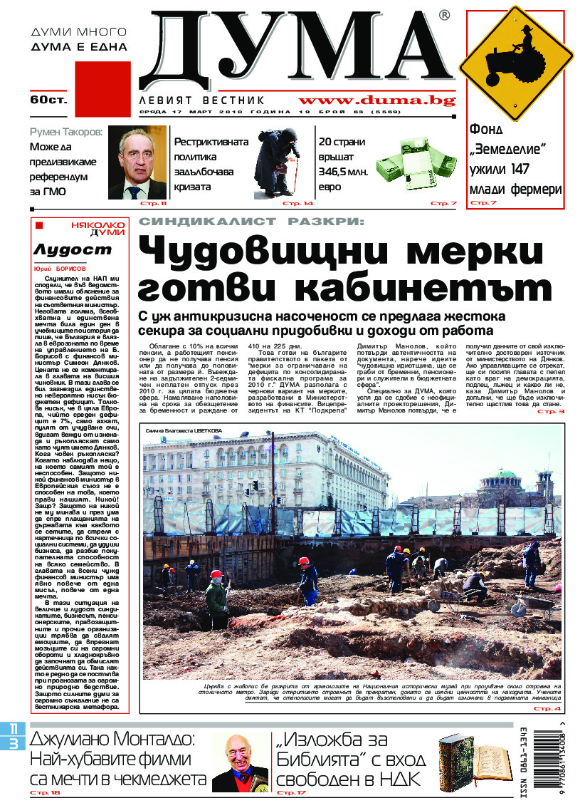 АБОНАМЕНТ за вестник „ДУМА“ за 2026 година. Можете да се абонирате в: „Български пощи“ АД до 15 декември 2025 г., „Доби прес“ ЕООД до 28 декември 2025 г., в редакцията на вестника до 20 декември 2025 г. Каталожен номер 6. Цени: 12 месеца - 149 € / 291,42 лв., 6 месеца - 75 € / 146,69 лв., 3 месеца - 40 € / 78,23 лв., 1 месец - 14 € / 27,38 лв. За повече информация тел. 02 9705 203 и 02 9705 216 отдел „Разпространение” на в-к ДУМА на ул. „Позитано” 20 А. E-mail: abonament@duma.bg АБОНАМЕНТ за вестник „ДУМА“ за 2026 година. Можете да се абонирате в: „Български пощи“ АД до 15 декември 2025 г., „Доби прес“ ЕООД до 28 декември 2025 г., в редакцията на вестника до 20 декември 2025 г. Каталожен номер 6. Цени: 12 месеца - 149 € / 291,42 лв., 6 месеца - 75 € / 146,69 лв., 3 месеца - 40 € / 78,23 лв., 1 месец - 14 € / 27,38 лв. За повече информация тел. 02 9705 203 и 02 9705 216 отдел „Разпространение” на в-к ДУМА на ул. „Позитано” 20 А. E-mail: abonament@duma.bg
