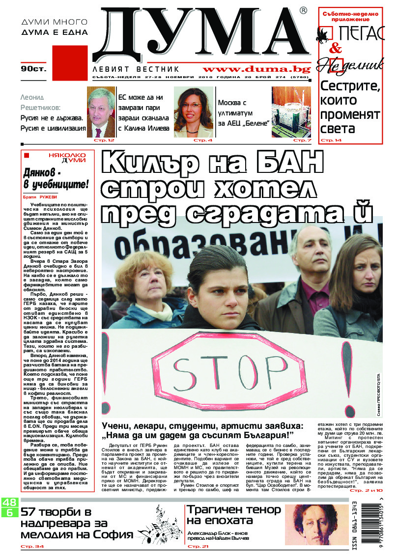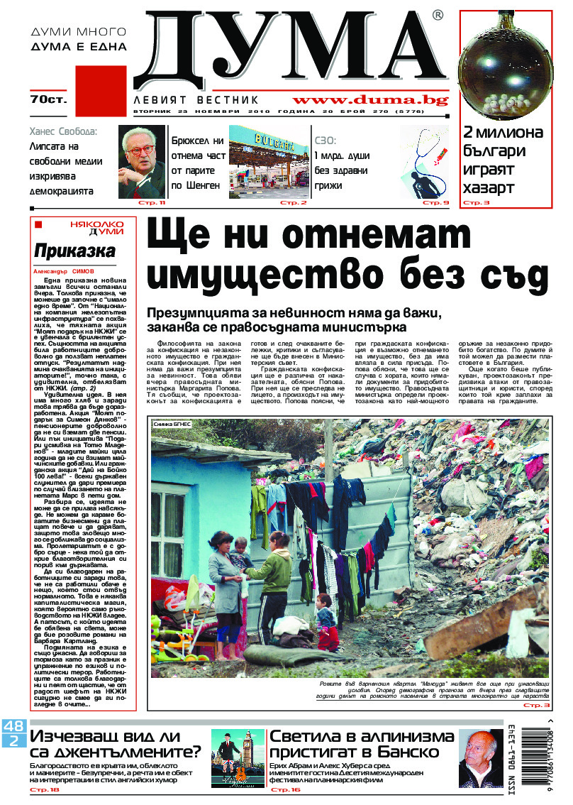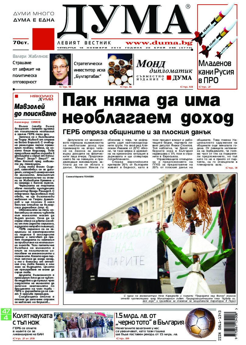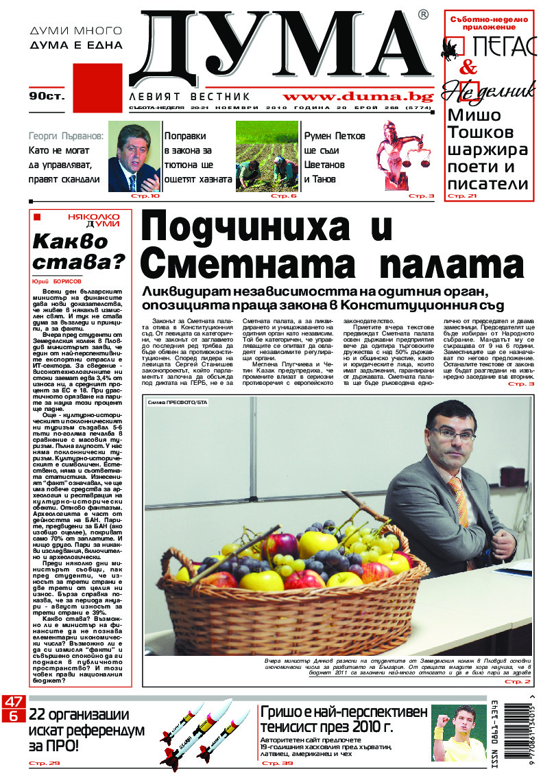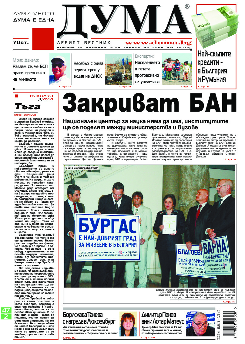 АБОНАМЕНТ за вестник „ДУМА“ за 2026 година. Можете да се абонирате в: „Български пощи“ АД до 15 декември 2025 г., „Доби прес“ ЕООД до 28 декември 2025 г., в редакцията на вестника до 20 декември 2025 г. Каталожен номер 6. Цени: 12 месеца - 149 € / 291,42 лв., 6 месеца - 75 € / 146,69 лв., 3 месеца - 40 € / 78,23 лв., 1 месец - 14 € / 27,38 лв. За повече информация тел. 02 9705 203 и 02 9705 216 отдел „Разпространение” на в-к ДУМА на ул. „Позитано” 20 А. E-mail: abonament@duma.bg АБОНАМЕНТ за вестник „ДУМА“ за 2026 година. Можете да се абонирате в: „Български пощи“ АД до 15 декември 2025 г., „Доби прес“ ЕООД до 28 декември 2025 г., в редакцията на вестника до 20 декември 2025 г. Каталожен номер 6. Цени: 12 месеца - 149 € / 291,42 лв., 6 месеца - 75 € / 146,69 лв., 3 месеца - 40 € / 78,23 лв., 1 месец - 14 € / 27,38 лв. За повече информация тел. 02 9705 203 и 02 9705 216 отдел „Разпространение” на в-к ДУМА на ул. „Позитано” 20 А. E-mail: abonament@duma.bg