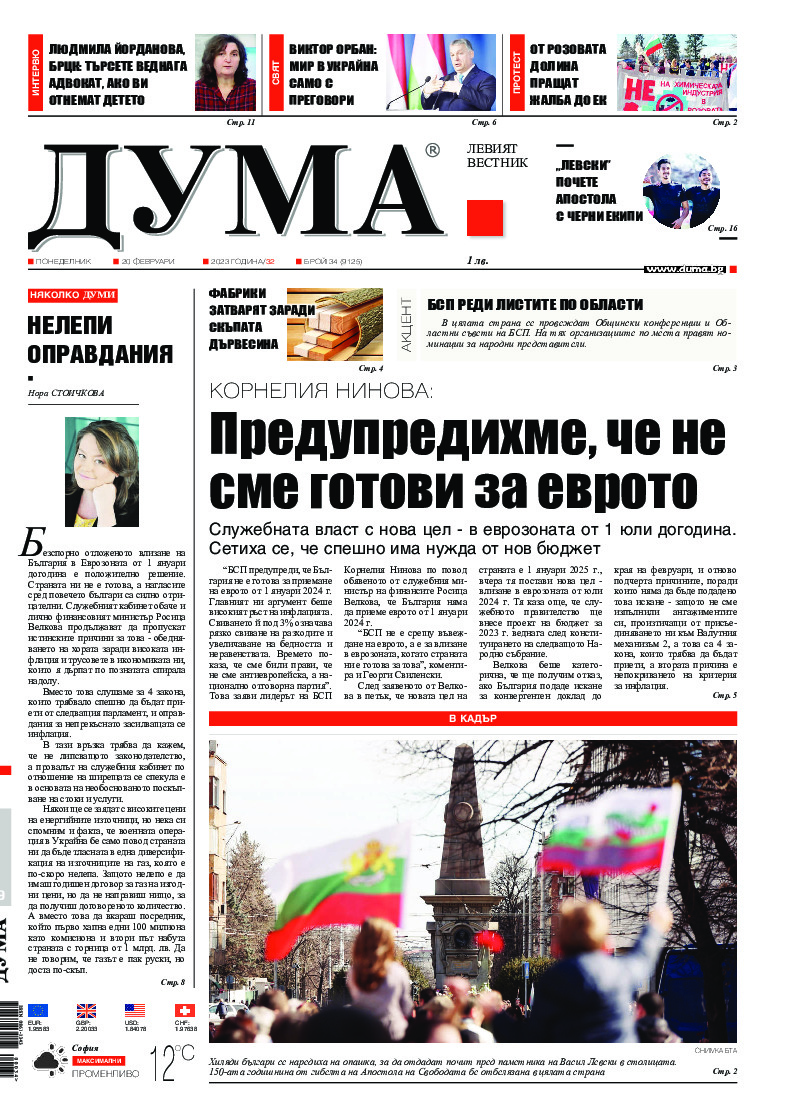 АБОНАМЕНТ за вестник „ДУМА“ за 2026 година. Можете да се абонирате в: „Български пощи“ АД до 15 декември 2025 г., „Доби прес“ ЕООД до 28 декември 2025 г., в редакцията на вестника до 20 декември 2025 г. Каталожен номер 6. Цени: 12 месеца - 149 € / 291,42 лв., 6 месеца - 75 € / 146,69 лв., 3 месеца - 40 € / 78,23 лв., 1 месец - 14 € / 27,38 лв. За повече информация тел. 02 9705 203 и 02 9705 216 отдел „Разпространение” на в-к ДУМА на ул. „Позитано” 20 А. E-mail: abonament@duma.bg АБОНАМЕНТ за вестник „ДУМА“ за 2026 година. Можете да се абонирате в: „Български пощи“ АД до 15 декември 2025 г., „Доби прес“ ЕООД до 28 декември 2025 г., в редакцията на вестника до 20 декември 2025 г. Каталожен номер 6. Цени: 12 месеца - 149 € / 291,42 лв., 6 месеца - 75 € / 146,69 лв., 3 месеца - 40 € / 78,23 лв., 1 месец - 14 € / 27,38 лв. За повече информация тел. 02 9705 203 и 02 9705 216 отдел „Разпространение” на в-к ДУМА на ул. „Позитано” 20 А. E-mail: abonament@duma.bg