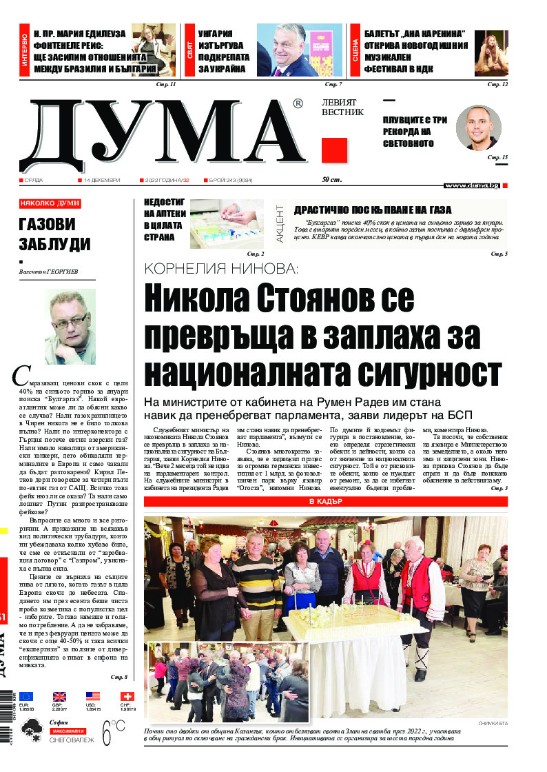 АБОНАМЕНТ за вестник „ДУМА“ за 2026 година. Можете да се абонирате в: „Български пощи“ АД до 15 декември 2025 г., „Доби прес“ ЕООД до 28 декември 2025 г., в редакцията на вестника до 20 декември 2025 г. Каталожен номер 6. Цени: 12 месеца - 149 € / 291,42 лв., 6 месеца - 75 € / 146,69 лв., 3 месеца - 40 € / 78,23 лв., 1 месец - 14 € / 27,38 лв. За повече информация тел. 02 9705 203 и 02 9705 216 отдел „Разпространение” на в-к ДУМА на ул. „Позитано” 20 А. E-mail: abonament@duma.bg АБОНАМЕНТ за вестник „ДУМА“ за 2026 година. Можете да се абонирате в: „Български пощи“ АД до 15 декември 2025 г., „Доби прес“ ЕООД до 28 декември 2025 г., в редакцията на вестника до 20 декември 2025 г. Каталожен номер 6. Цени: 12 месеца - 149 € / 291,42 лв., 6 месеца - 75 € / 146,69 лв., 3 месеца - 40 € / 78,23 лв., 1 месец - 14 € / 27,38 лв. За повече информация тел. 02 9705 203 и 02 9705 216 отдел „Разпространение” на в-к ДУМА на ул. „Позитано” 20 А. E-mail: abonament@duma.bg