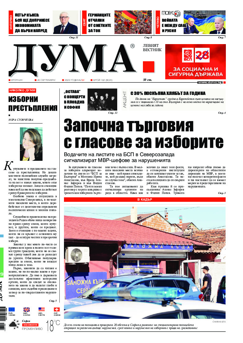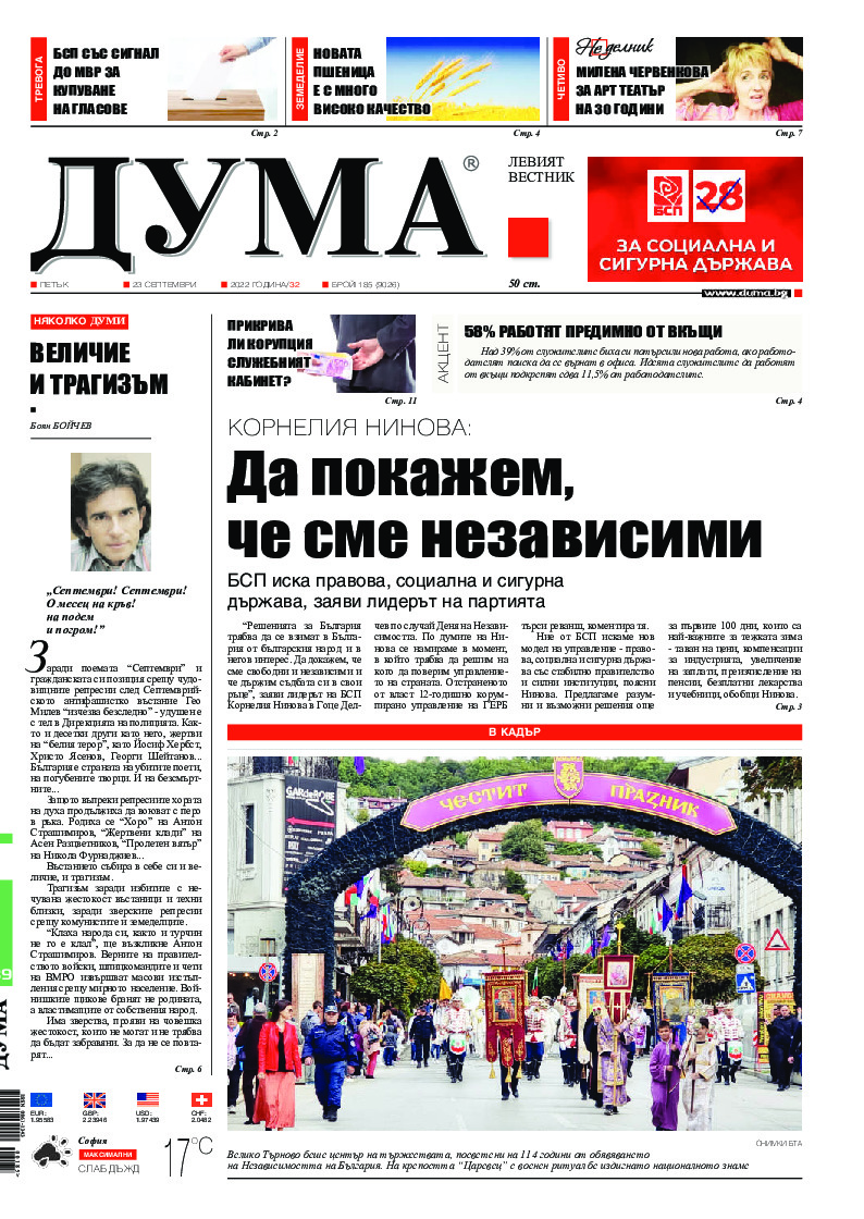 АБОНАМЕНТ за вестник „ДУМА“ за 2026 година. Можете да се абонирате в: „Български пощи“ АД до 15 декември 2025 г., „Доби прес“ ЕООД до 28 декември 2025 г., в редакцията на вестника до 20 декември 2025 г. Каталожен номер 6. Цени: 12 месеца - 149 € / 291,42 лв., 6 месеца - 75 € / 146,69 лв., 3 месеца - 40 € / 78,23 лв., 1 месец - 14 € / 27,38 лв. За повече информация тел. 02 9705 203 и 02 9705 216 отдел „Разпространение” на в-к ДУМА на ул. „Позитано” 20 А. E-mail: abonament@duma.bg АБОНАМЕНТ за вестник „ДУМА“ за 2026 година. Можете да се абонирате в: „Български пощи“ АД до 15 декември 2025 г., „Доби прес“ ЕООД до 28 декември 2025 г., в редакцията на вестника до 20 декември 2025 г. Каталожен номер 6. Цени: 12 месеца - 149 € / 291,42 лв., 6 месеца - 75 € / 146,69 лв., 3 месеца - 40 € / 78,23 лв., 1 месец - 14 € / 27,38 лв. За повече информация тел. 02 9705 203 и 02 9705 216 отдел „Разпространение” на в-к ДУМА на ул. „Позитано” 20 А. E-mail: abonament@duma.bg