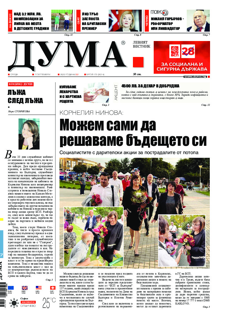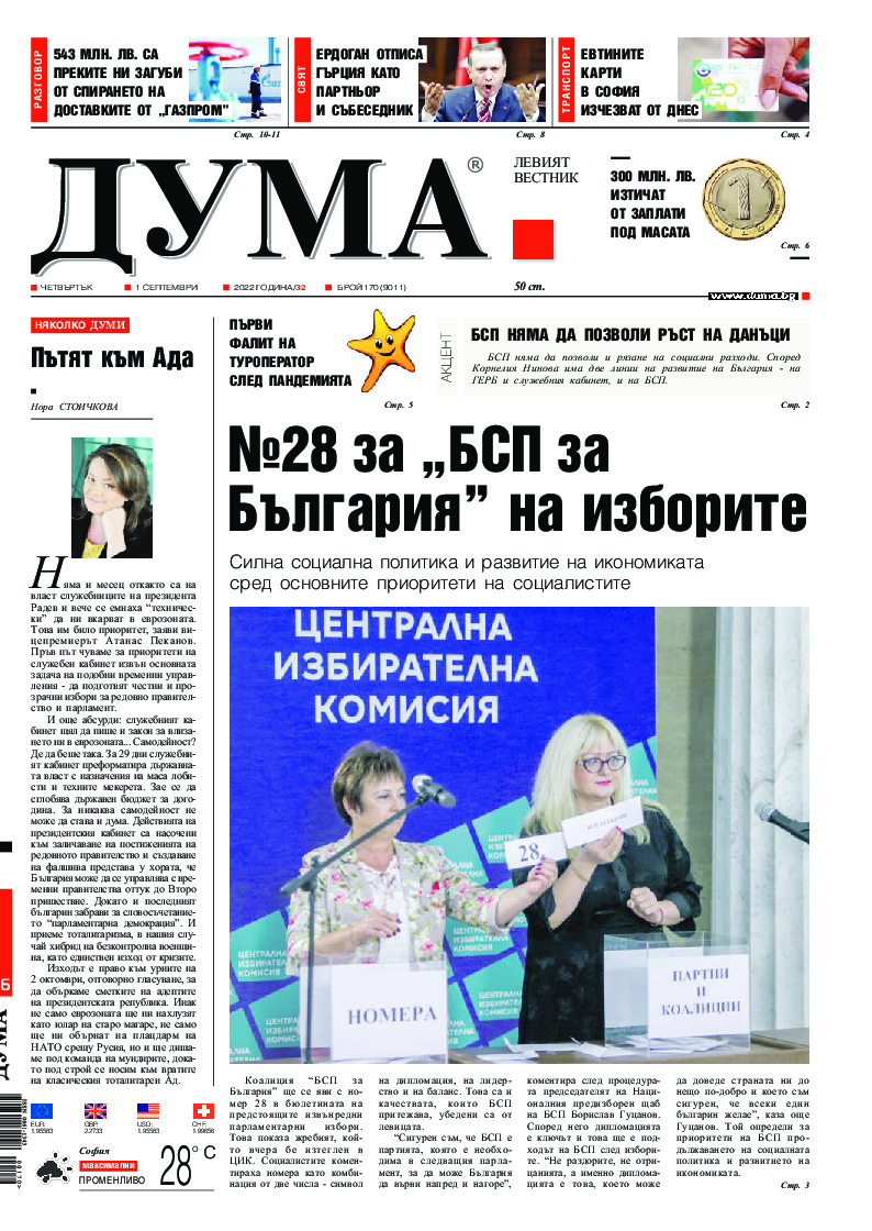 АБОНАМЕНТ за вестник „ДУМА“ за 2026 година. Можете да се абонирате в: „Български пощи“ АД до 15 декември 2025 г., „Доби прес“ ЕООД до 28 декември 2025 г., в редакцията на вестника до 20 декември 2025 г. Каталожен номер 6. Цени: 12 месеца - 149 € / 291,42 лв., 6 месеца - 75 € / 146,69 лв., 3 месеца - 40 € / 78,23 лв., 1 месец - 14 € / 27,38 лв. За повече информация тел. 02 9705 203 и 02 9705 216 отдел „Разпространение” на в-к ДУМА на ул. „Позитано” 20 А. E-mail: abonament@duma.bg АБОНАМЕНТ за вестник „ДУМА“ за 2026 година. Можете да се абонирате в: „Български пощи“ АД до 15 декември 2025 г., „Доби прес“ ЕООД до 28 декември 2025 г., в редакцията на вестника до 20 декември 2025 г. Каталожен номер 6. Цени: 12 месеца - 149 € / 291,42 лв., 6 месеца - 75 € / 146,69 лв., 3 месеца - 40 € / 78,23 лв., 1 месец - 14 € / 27,38 лв. За повече информация тел. 02 9705 203 и 02 9705 216 отдел „Разпространение” на в-к ДУМА на ул. „Позитано” 20 А. E-mail: abonament@duma.bg