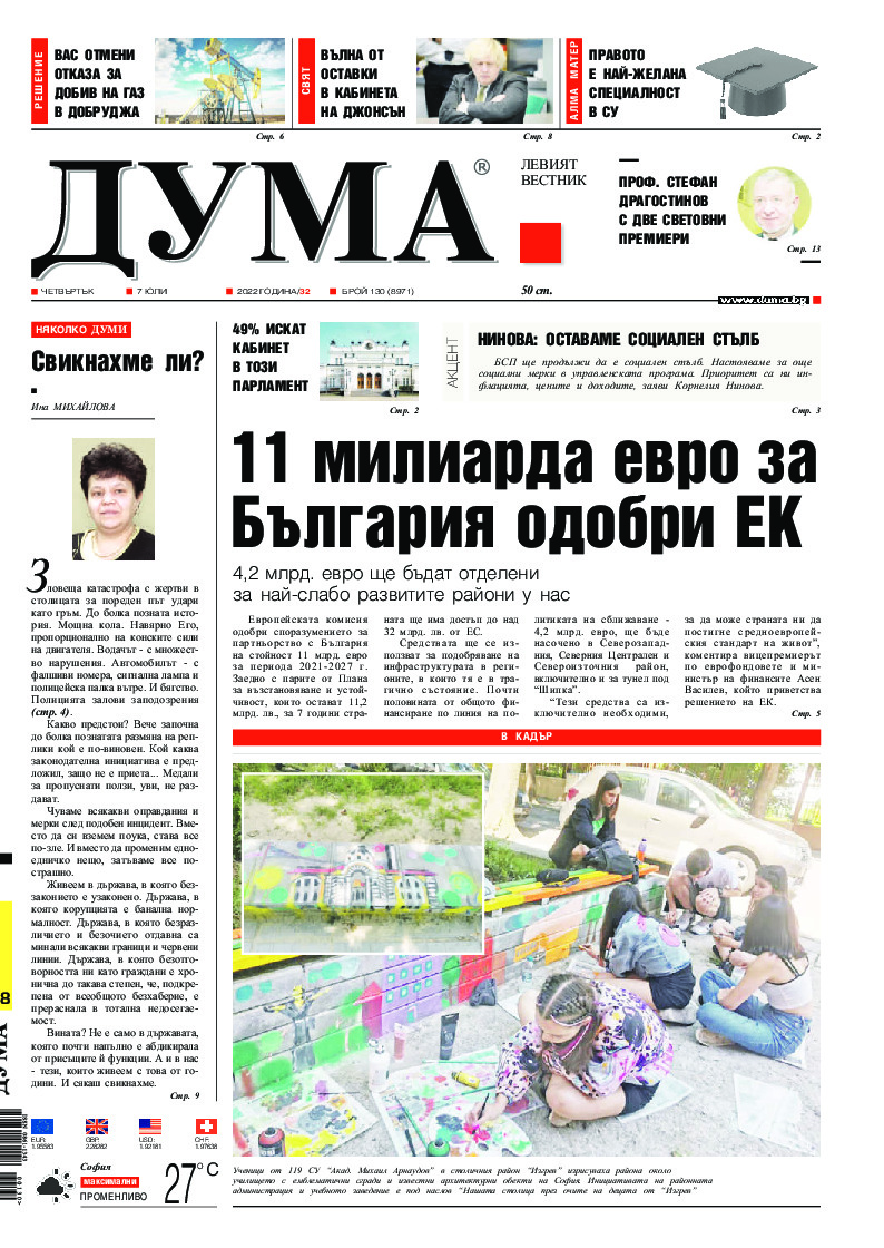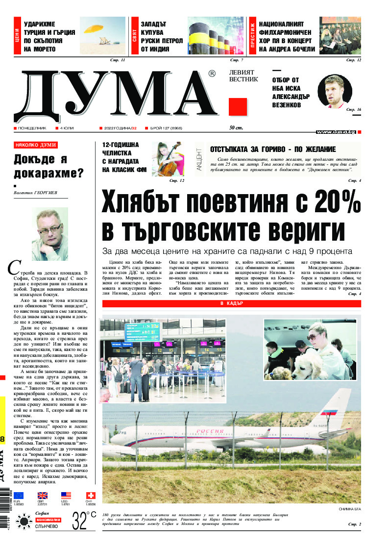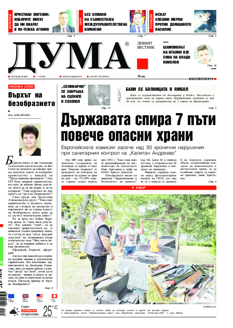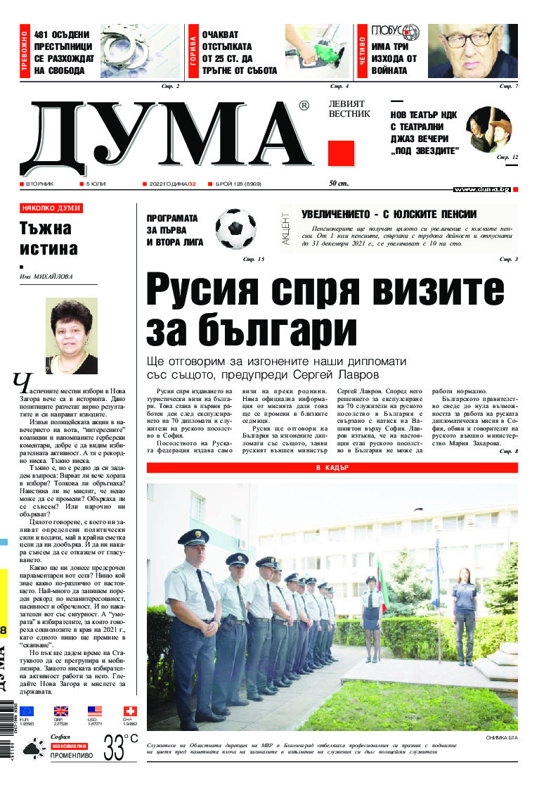 АБОНАМЕНТ за вестник „ДУМА“ за 2026 година. Можете да се абонирате в: „Български пощи“ АД до 15 декември 2025 г., „Доби прес“ ЕООД до 28 декември 2025 г., в редакцията на вестника до 20 декември 2025 г. Каталожен номер 6. Цени: 12 месеца - 149 € / 291,42 лв., 6 месеца - 75 € / 146,69 лв., 3 месеца - 40 € / 78,23 лв., 1 месец - 14 € / 27,38 лв. За повече информация тел. 02 9705 203 и 02 9705 216 отдел „Разпространение” на в-к ДУМА на ул. „Позитано” 20 А. E-mail: abonament@duma.bg АБОНАМЕНТ за вестник „ДУМА“ за 2026 година. Можете да се абонирате в: „Български пощи“ АД до 15 декември 2025 г., „Доби прес“ ЕООД до 28 декември 2025 г., в редакцията на вестника до 20 декември 2025 г. Каталожен номер 6. Цени: 12 месеца - 149 € / 291,42 лв., 6 месеца - 75 € / 146,69 лв., 3 месеца - 40 € / 78,23 лв., 1 месец - 14 € / 27,38 лв. За повече информация тел. 02 9705 203 и 02 9705 216 отдел „Разпространение” на в-к ДУМА на ул. „Позитано” 20 А. E-mail: abonament@duma.bg