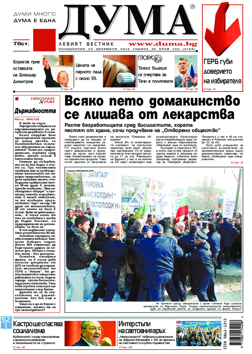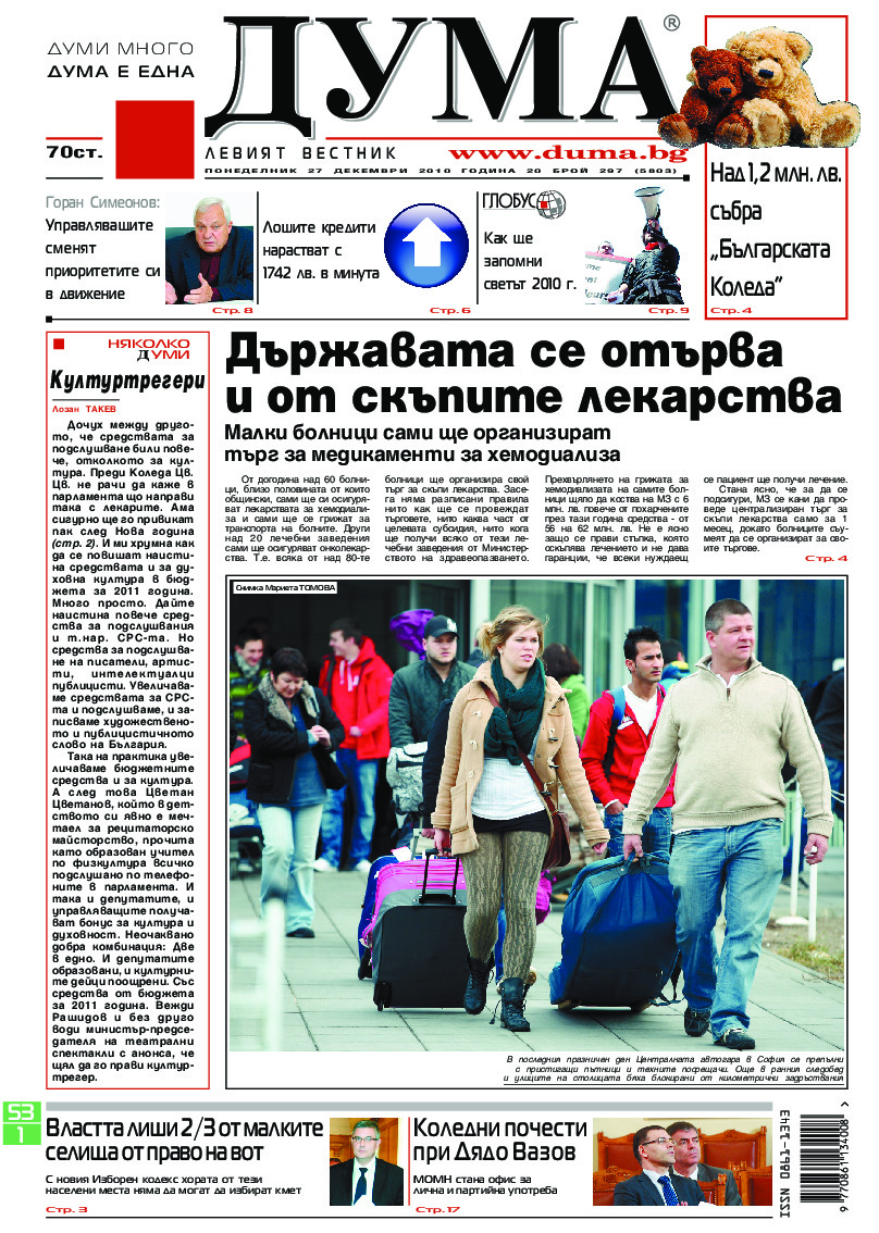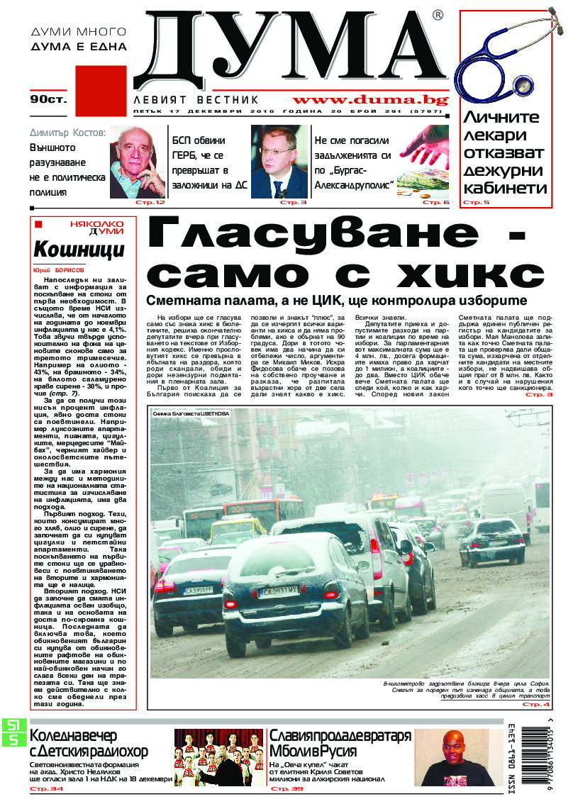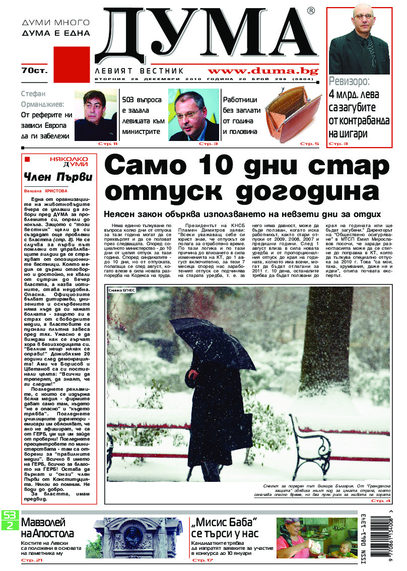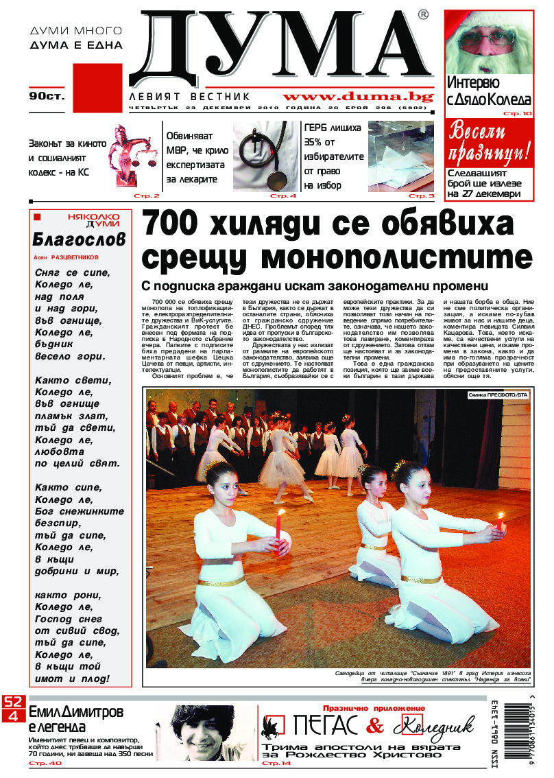 АБОНАМЕНТ за вестник „ДУМА“ за 2026 година. Можете да се абонирате в: „Български пощи“ АД до 15 декември 2025 г., „Доби прес“ ЕООД до 28 декември 2025 г., в редакцията на вестника до 20 декември 2025 г. Каталожен номер 6. Цени: 12 месеца - 149 € / 291,42 лв., 6 месеца - 75 € / 146,69 лв., 3 месеца - 40 € / 78,23 лв., 1 месец - 14 € / 27,38 лв. За повече информация тел. 02 9705 203 и 02 9705 216 отдел „Разпространение” на в-к ДУМА на ул. „Позитано” 20 А. E-mail: abonament@duma.bg АБОНАМЕНТ за вестник „ДУМА“ за 2026 година. Можете да се абонирате в: „Български пощи“ АД до 15 декември 2025 г., „Доби прес“ ЕООД до 28 декември 2025 г., в редакцията на вестника до 20 декември 2025 г. Каталожен номер 6. Цени: 12 месеца - 149 € / 291,42 лв., 6 месеца - 75 € / 146,69 лв., 3 месеца - 40 € / 78,23 лв., 1 месец - 14 € / 27,38 лв. За повече информация тел. 02 9705 203 и 02 9705 216 отдел „Разпространение” на в-к ДУМА на ул. „Позитано” 20 А. E-mail: abonament@duma.bg