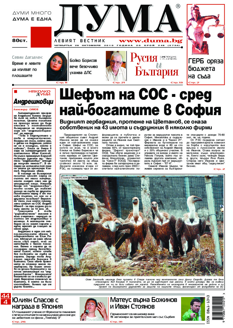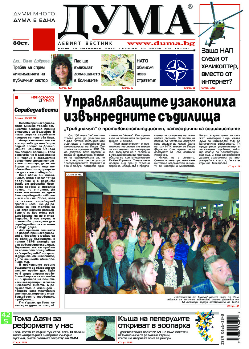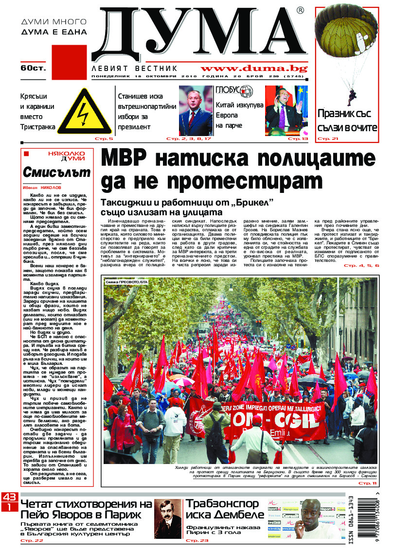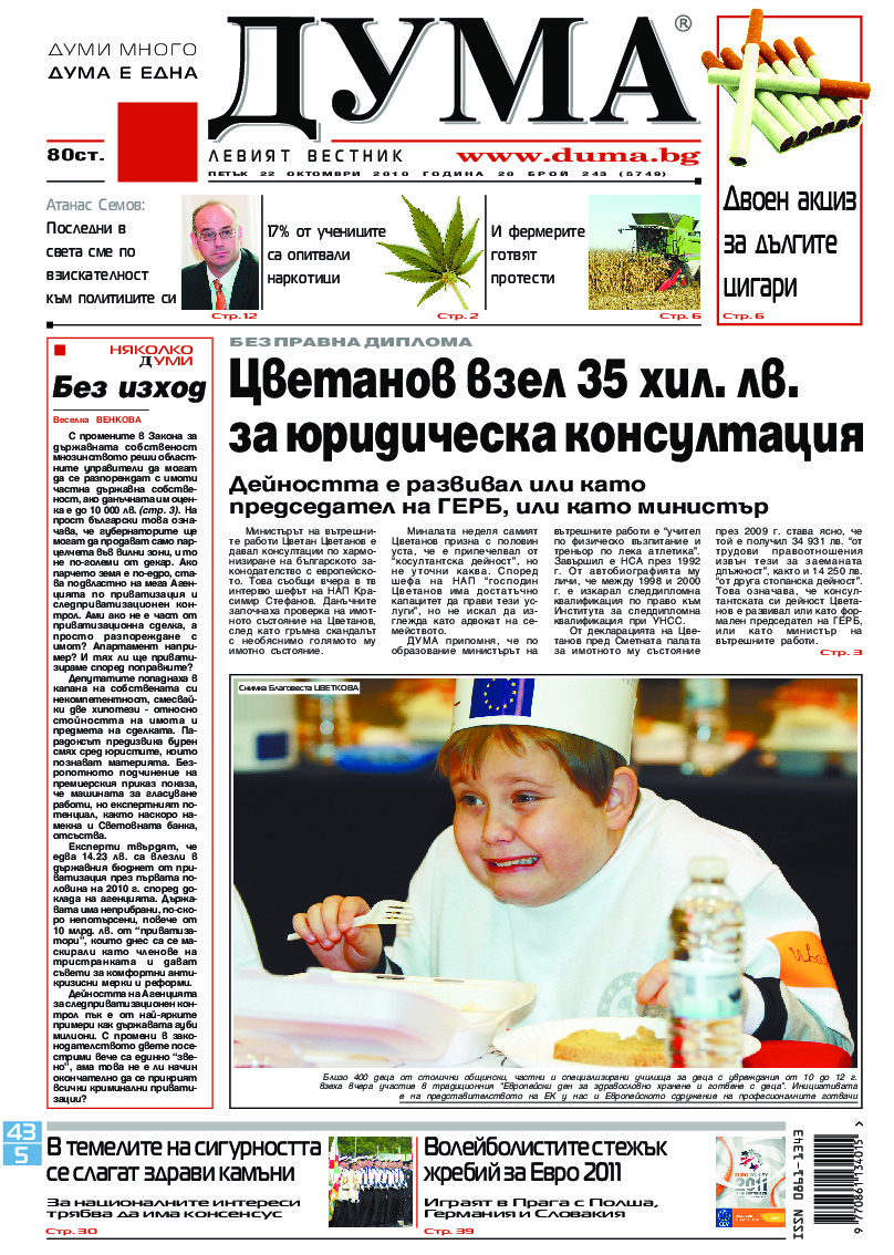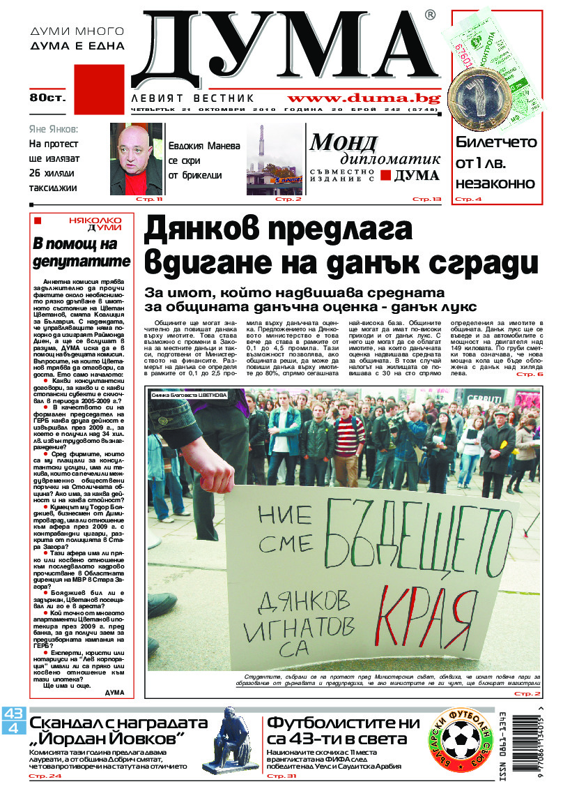 АБОНАМЕНТ за вестник „ДУМА“ за 2026 година. Можете да се абонирате в: „Български пощи“ АД до 15 декември 2025 г., „Доби прес“ ЕООД до 28 декември 2025 г., в редакцията на вестника до 20 декември 2025 г. Каталожен номер 6. Цени: 12 месеца - 149 € / 291,42 лв., 6 месеца - 75 € / 146,69 лв., 3 месеца - 40 € / 78,23 лв., 1 месец - 14 € / 27,38 лв. За повече информация тел. 02 9705 203 и 02 9705 216 отдел „Разпространение” на в-к ДУМА на ул. „Позитано” 20 А. E-mail: abonament@duma.bg АБОНАМЕНТ за вестник „ДУМА“ за 2026 година. Можете да се абонирате в: „Български пощи“ АД до 15 декември 2025 г., „Доби прес“ ЕООД до 28 декември 2025 г., в редакцията на вестника до 20 декември 2025 г. Каталожен номер 6. Цени: 12 месеца - 149 € / 291,42 лв., 6 месеца - 75 € / 146,69 лв., 3 месеца - 40 € / 78,23 лв., 1 месец - 14 € / 27,38 лв. За повече информация тел. 02 9705 203 и 02 9705 216 отдел „Разпространение” на в-к ДУМА на ул. „Позитано” 20 А. E-mail: abonament@duma.bg