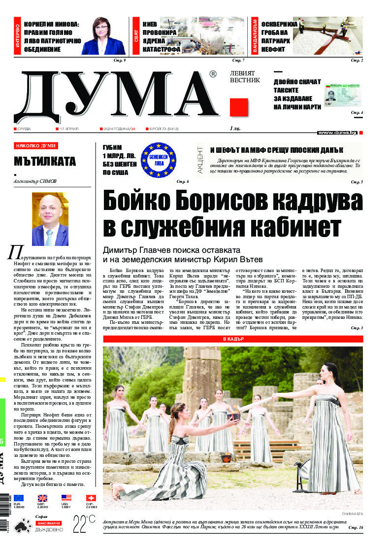 АБОНАМЕНТ за вестник „ДУМА“ за 2026 година. Можете да се абонирате в: „Български пощи“ АД до 15 декември 2025 г., „Доби прес“ ЕООД до 28 декември 2025 г., в редакцията на вестника до 20 декември 2025 г. Каталожен номер 6. Цени: 12 месеца - 149 € / 291,42 лв., 6 месеца - 75 € / 146,69 лв., 3 месеца - 40 € / 78,23 лв., 1 месец - 14 € / 27,38 лв. За повече информация тел. 02 9705 203 и 02 9705 216 отдел „Разпространение” на в-к ДУМА на ул. „Позитано” 20 А. E-mail: abonament@duma.bg АБОНАМЕНТ за вестник „ДУМА“ за 2026 година. Можете да се абонирате в: „Български пощи“ АД до 15 декември 2025 г., „Доби прес“ ЕООД до 28 декември 2025 г., в редакцията на вестника до 20 декември 2025 г. Каталожен номер 6. Цени: 12 месеца - 149 € / 291,42 лв., 6 месеца - 75 € / 146,69 лв., 3 месеца - 40 € / 78,23 лв., 1 месец - 14 € / 27,38 лв. За повече информация тел. 02 9705 203 и 02 9705 216 отдел „Разпространение” на в-к ДУМА на ул. „Позитано” 20 А. E-mail: abonament@duma.bg