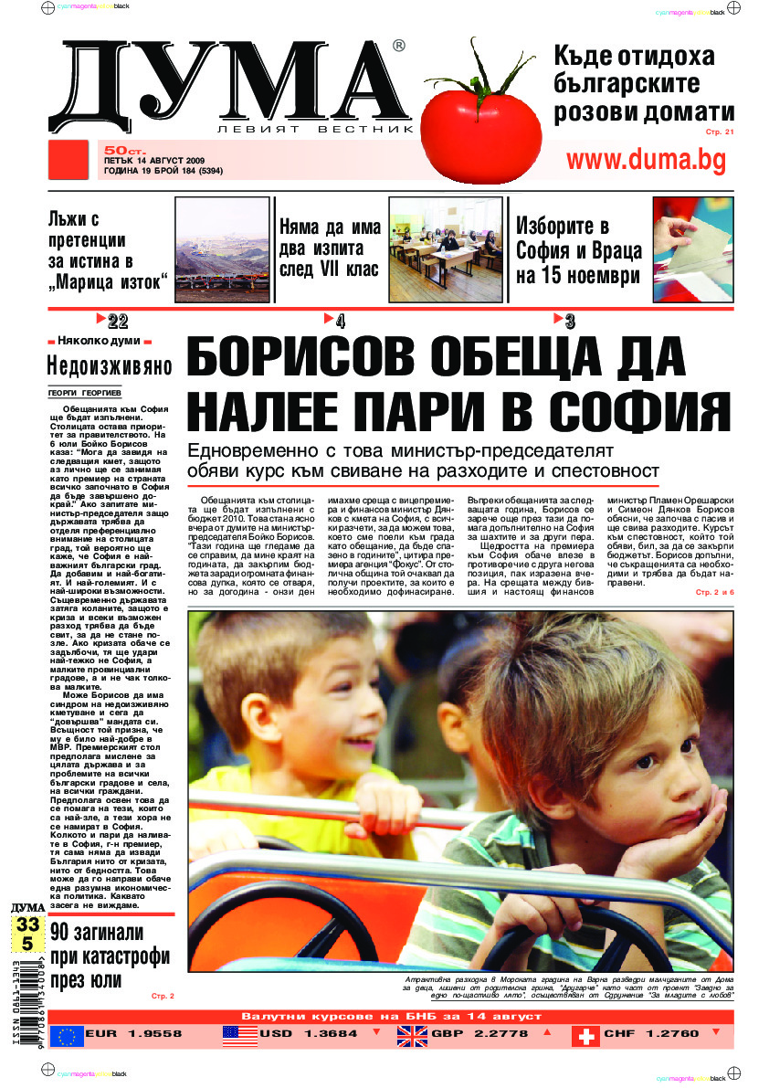 АБОНАМЕНТ за вестник „ДУМА“ за 2026 година. Можете да се абонирате в: „Български пощи“ АД до 15 декември 2025 г., „Доби прес“ ЕООД до 28 декември 2025 г., в редакцията на вестника до 20 декември 2025 г. Каталожен номер 6. Цени: 12 месеца - 149 € / 291,42 лв., 6 месеца - 75 € / 146,69 лв., 3 месеца - 40 € / 78,23 лв., 1 месец - 14 € / 27,38 лв. За повече информация тел. 02 9705 203 и 02 9705 216 отдел „Разпространение” на в-к ДУМА на ул. „Позитано” 20 А. E-mail: abonament@duma.bg АБОНАМЕНТ за вестник „ДУМА“ за 2026 година. Можете да се абонирате в: „Български пощи“ АД до 15 декември 2025 г., „Доби прес“ ЕООД до 28 декември 2025 г., в редакцията на вестника до 20 декември 2025 г. Каталожен номер 6. Цени: 12 месеца - 149 € / 291,42 лв., 6 месеца - 75 € / 146,69 лв., 3 месеца - 40 € / 78,23 лв., 1 месец - 14 € / 27,38 лв. За повече информация тел. 02 9705 203 и 02 9705 216 отдел „Разпространение” на в-к ДУМА на ул. „Позитано” 20 А. E-mail: abonament@duma.bg
