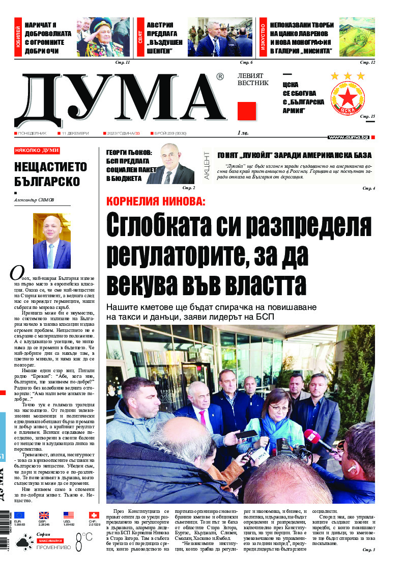 АБОНАМЕНТ за вестник „ДУМА“ за 2026 година. Можете да се абонирате в: „Български пощи“ АД до 15 декември 2025 г., „Доби прес“ ЕООД до 28 декември 2025 г., в редакцията на вестника до 20 декември 2025 г. Каталожен номер 6. Цени: 12 месеца - 149 € / 291,42 лв., 6 месеца - 75 € / 146,69 лв., 3 месеца - 40 € / 78,23 лв., 1 месец - 14 € / 27,38 лв. За повече информация тел. 02 9705 203 и 02 9705 216 отдел „Разпространение” на в-к ДУМА на ул. „Позитано” 20 А. E-mail: abonament@duma.bg АБОНАМЕНТ за вестник „ДУМА“ за 2026 година. Можете да се абонирате в: „Български пощи“ АД до 15 декември 2025 г., „Доби прес“ ЕООД до 28 декември 2025 г., в редакцията на вестника до 20 декември 2025 г. Каталожен номер 6. Цени: 12 месеца - 149 € / 291,42 лв., 6 месеца - 75 € / 146,69 лв., 3 месеца - 40 € / 78,23 лв., 1 месец - 14 € / 27,38 лв. За повече информация тел. 02 9705 203 и 02 9705 216 отдел „Разпространение” на в-к ДУМА на ул. „Позитано” 20 А. E-mail: abonament@duma.bg