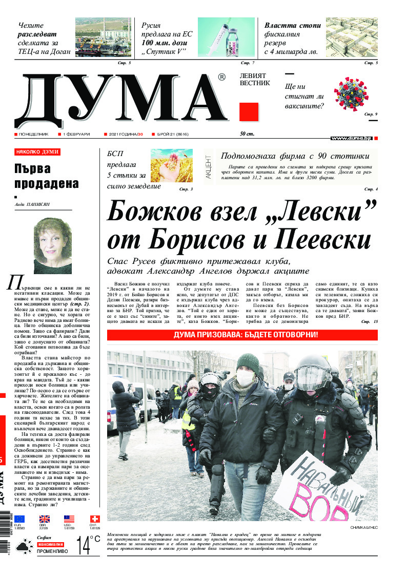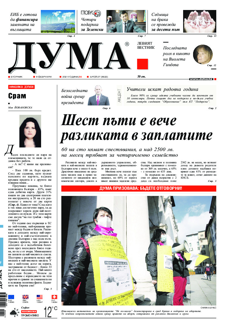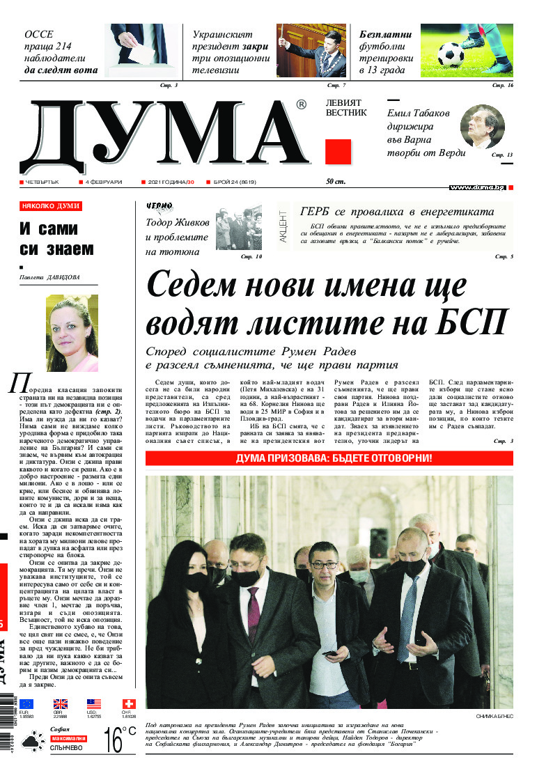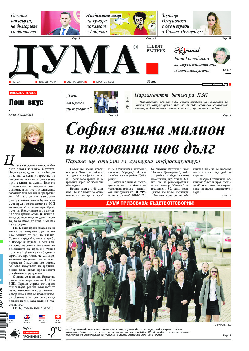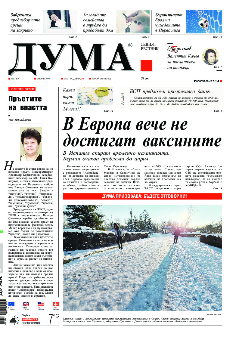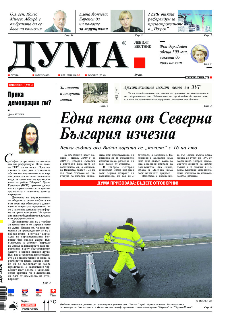 АБОНАМЕНТ за вестник „ДУМА“ за 2026 година. Можете да се абонирате в: „Български пощи“ АД до 15 декември 2025 г., „Доби прес“ ЕООД до 28 декември 2025 г., в редакцията на вестника до 20 декември 2025 г. Каталожен номер 6. Цени: 12 месеца - 149 € / 291,42 лв., 6 месеца - 75 € / 146,69 лв., 3 месеца - 40 € / 78,23 лв., 1 месец - 14 € / 27,38 лв. За повече информация тел. 02 9705 203 и 02 9705 216 отдел „Разпространение” на в-к ДУМА на ул. „Позитано” 20 А. E-mail: abonament@duma.bg АБОНАМЕНТ за вестник „ДУМА“ за 2026 година. Можете да се абонирате в: „Български пощи“ АД до 15 декември 2025 г., „Доби прес“ ЕООД до 28 декември 2025 г., в редакцията на вестника до 20 декември 2025 г. Каталожен номер 6. Цени: 12 месеца - 149 € / 291,42 лв., 6 месеца - 75 € / 146,69 лв., 3 месеца - 40 € / 78,23 лв., 1 месец - 14 € / 27,38 лв. За повече информация тел. 02 9705 203 и 02 9705 216 отдел „Разпространение” на в-к ДУМА на ул. „Позитано” 20 А. E-mail: abonament@duma.bg