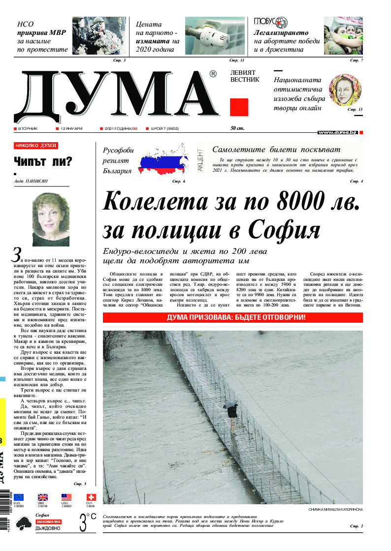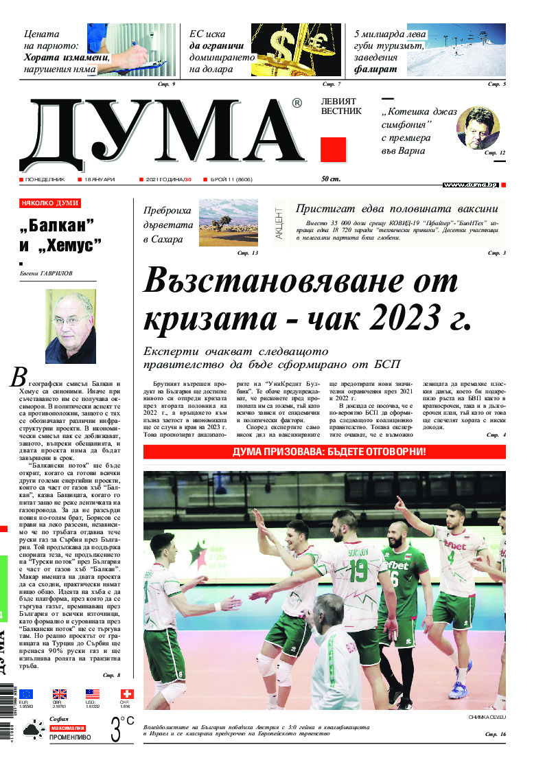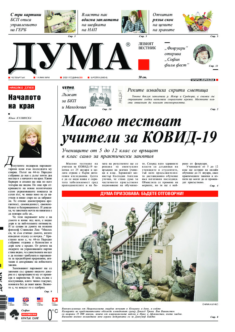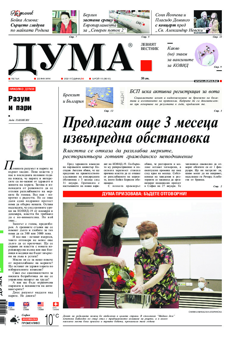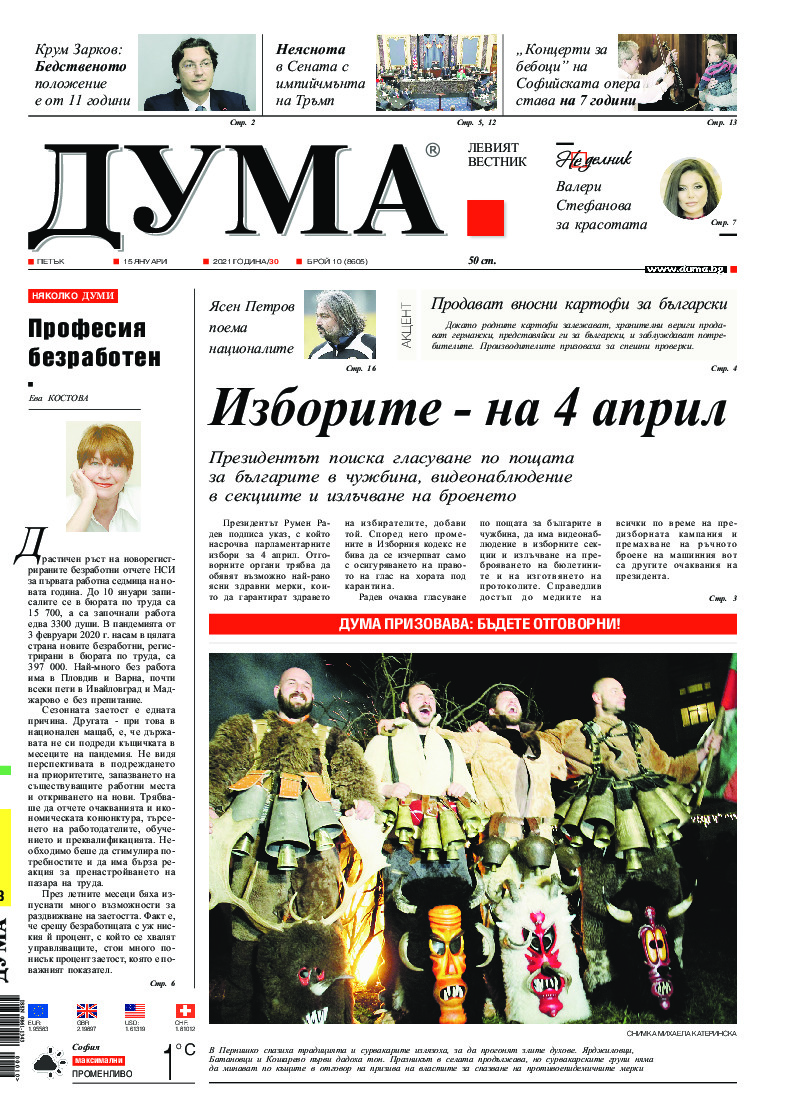 АБОНАМЕНТ за вестник „ДУМА“ за 2026 година. Можете да се абонирате в: „Български пощи“ АД до 15 декември 2025 г., „Доби прес“ ЕООД до 28 декември 2025 г., в редакцията на вестника до 20 декември 2025 г. Каталожен номер 6. Цени: 12 месеца - 149 € / 291,42 лв., 6 месеца - 75 € / 146,69 лв., 3 месеца - 40 € / 78,23 лв., 1 месец - 14 € / 27,38 лв. За повече информация тел. 02 9705 203 и 02 9705 216 отдел „Разпространение” на в-к ДУМА на ул. „Позитано” 20 А. E-mail: abonament@duma.bg АБОНАМЕНТ за вестник „ДУМА“ за 2026 година. Можете да се абонирате в: „Български пощи“ АД до 15 декември 2025 г., „Доби прес“ ЕООД до 28 декември 2025 г., в редакцията на вестника до 20 декември 2025 г. Каталожен номер 6. Цени: 12 месеца - 149 € / 291,42 лв., 6 месеца - 75 € / 146,69 лв., 3 месеца - 40 € / 78,23 лв., 1 месец - 14 € / 27,38 лв. За повече информация тел. 02 9705 203 и 02 9705 216 отдел „Разпространение” на в-к ДУМА на ул. „Позитано” 20 А. E-mail: abonament@duma.bg
