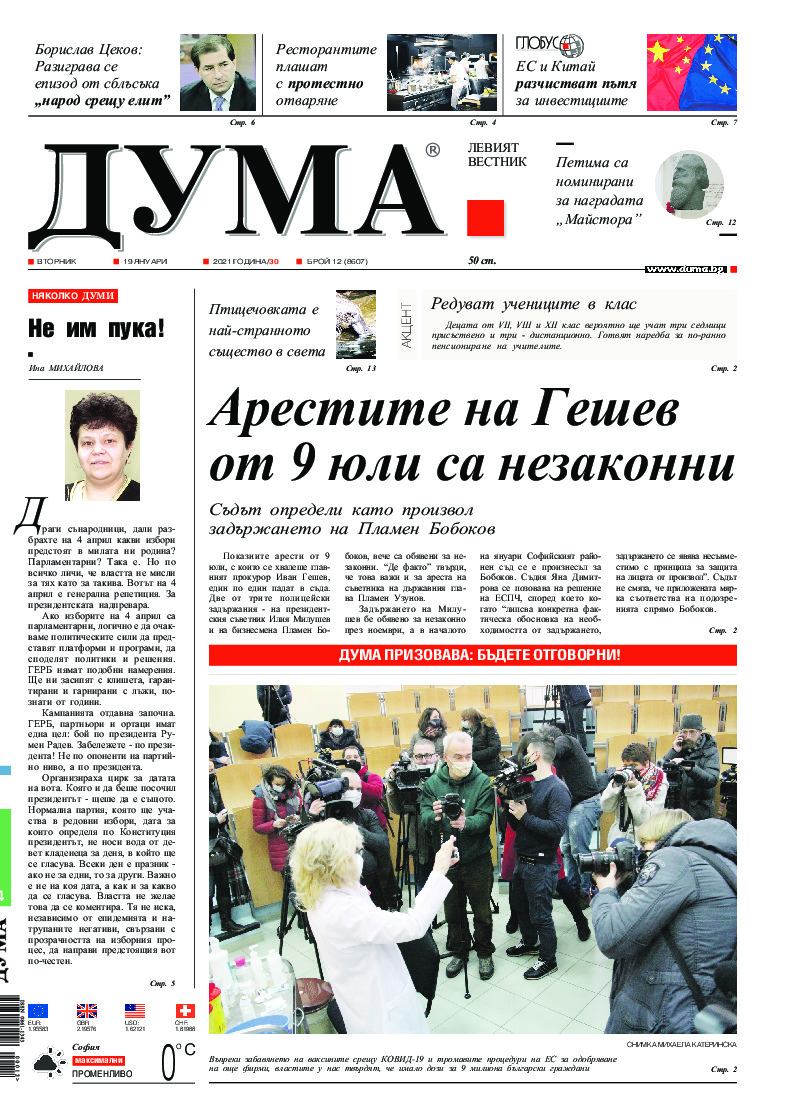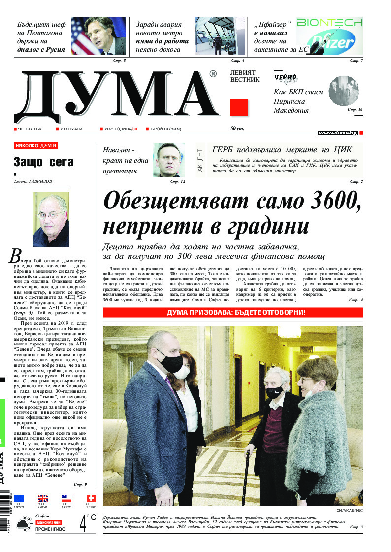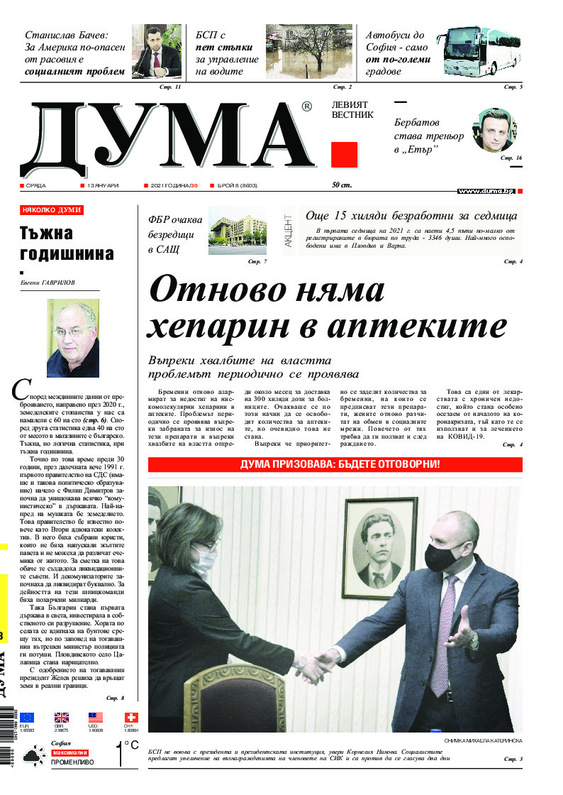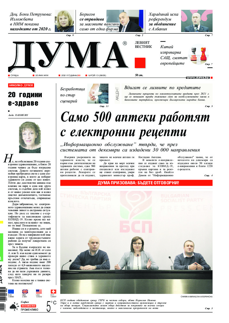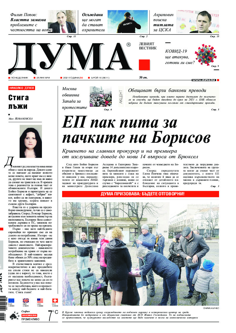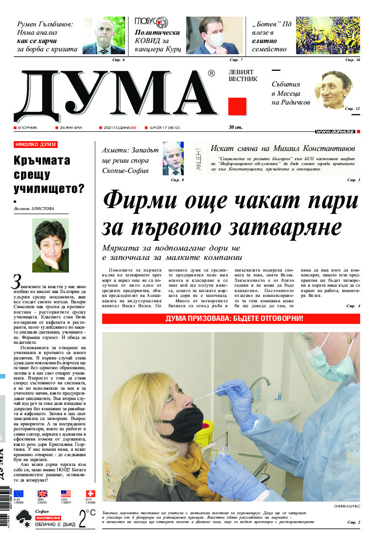 АБОНАМЕНТ за вестник „ДУМА“ за 2026 година. Можете да се абонирате в: „Български пощи“ АД до 15 декември 2025 г., „Доби прес“ ЕООД до 28 декември 2025 г., в редакцията на вестника до 20 декември 2025 г. Каталожен номер 6. Цени: 12 месеца - 149 € / 291,42 лв., 6 месеца - 75 € / 146,69 лв., 3 месеца - 40 € / 78,23 лв., 1 месец - 14 € / 27,38 лв. За повече информация тел. 02 9705 203 и 02 9705 216 отдел „Разпространение” на в-к ДУМА на ул. „Позитано” 20 А. E-mail: abonament@duma.bg АБОНАМЕНТ за вестник „ДУМА“ за 2026 година. Можете да се абонирате в: „Български пощи“ АД до 15 декември 2025 г., „Доби прес“ ЕООД до 28 декември 2025 г., в редакцията на вестника до 20 декември 2025 г. Каталожен номер 6. Цени: 12 месеца - 149 € / 291,42 лв., 6 месеца - 75 € / 146,69 лв., 3 месеца - 40 € / 78,23 лв., 1 месец - 14 € / 27,38 лв. За повече информация тел. 02 9705 203 и 02 9705 216 отдел „Разпространение” на в-к ДУМА на ул. „Позитано” 20 А. E-mail: abonament@duma.bg