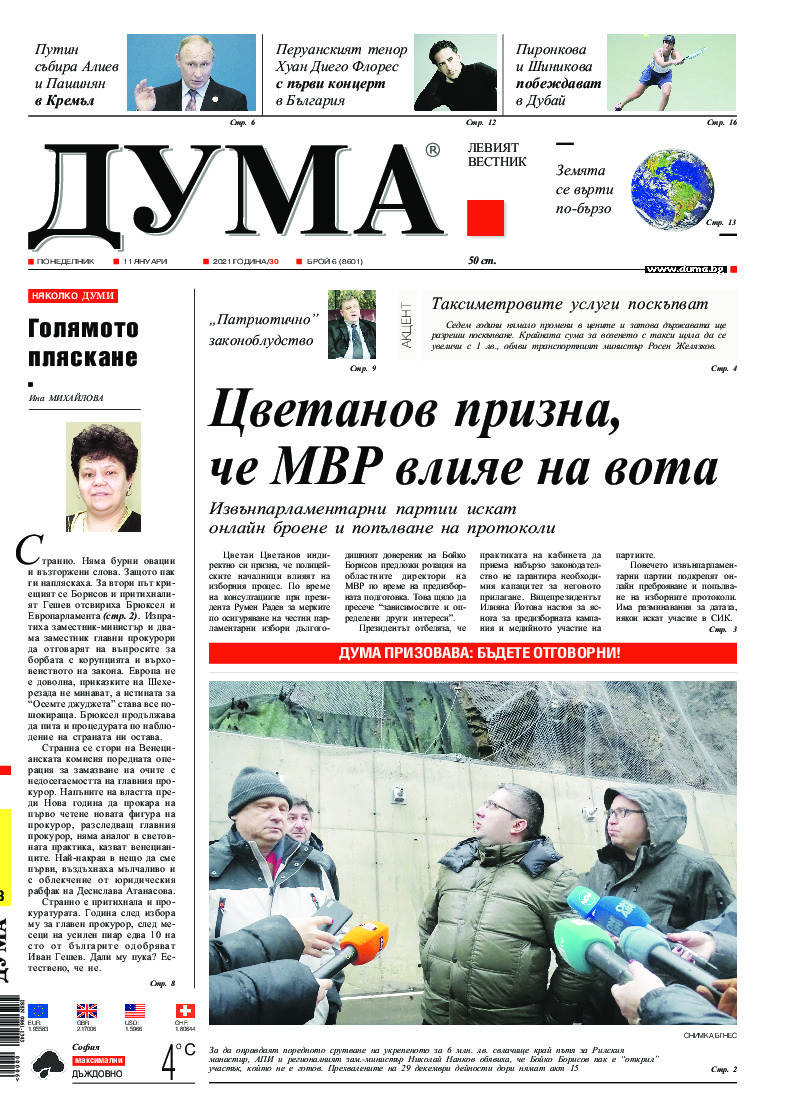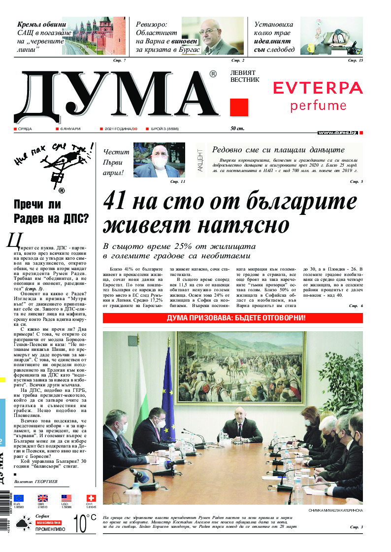 АБОНАМЕНТ за вестник „ДУМА“ за 2026 година. Можете да се абонирате в: „Български пощи“ АД до 15 декември 2025 г., „Доби прес“ ЕООД до 28 декември 2025 г., в редакцията на вестника до 20 декември 2025 г. Каталожен номер 6. Цени: 12 месеца - 149 € / 291,42 лв., 6 месеца - 75 € / 146,69 лв., 3 месеца - 40 € / 78,23 лв., 1 месец - 14 € / 27,38 лв. За повече информация тел. 02 9705 203 и 02 9705 216 отдел „Разпространение” на в-к ДУМА на ул. „Позитано” 20 А. E-mail: abonament@duma.bg АБОНАМЕНТ за вестник „ДУМА“ за 2026 година. Можете да се абонирате в: „Български пощи“ АД до 15 декември 2025 г., „Доби прес“ ЕООД до 28 декември 2025 г., в редакцията на вестника до 20 декември 2025 г. Каталожен номер 6. Цени: 12 месеца - 149 € / 291,42 лв., 6 месеца - 75 € / 146,69 лв., 3 месеца - 40 € / 78,23 лв., 1 месец - 14 € / 27,38 лв. За повече информация тел. 02 9705 203 и 02 9705 216 отдел „Разпространение” на в-к ДУМА на ул. „Позитано” 20 А. E-mail: abonament@duma.bg