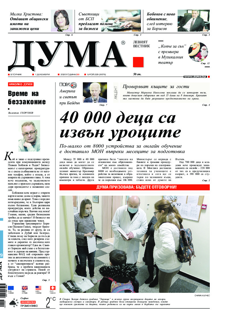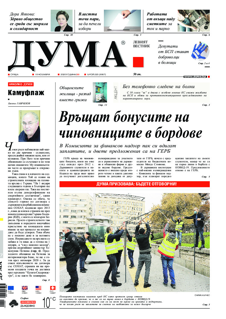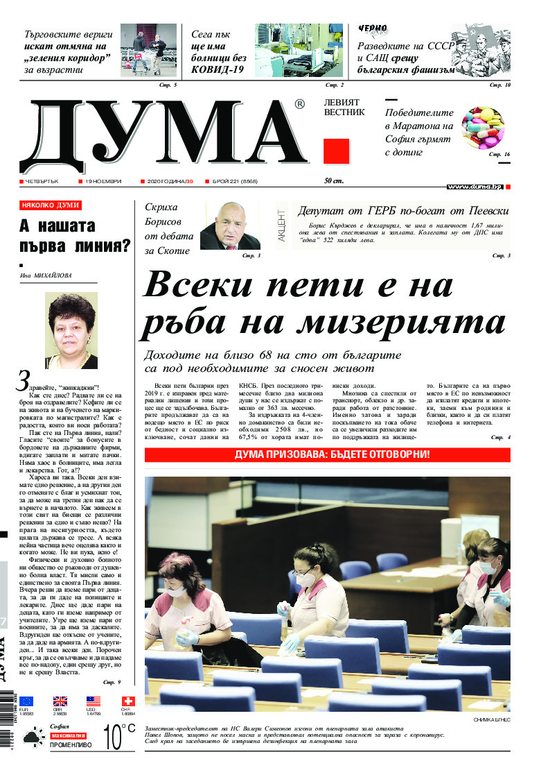 АБОНАМЕНТ за вестник „ДУМА“ за 2026 година. Можете да се абонирате в: „Български пощи“ АД до 15 декември 2025 г., „Доби прес“ ЕООД до 28 декември 2025 г., в редакцията на вестника до 20 декември 2025 г. Каталожен номер 6. Цени: 12 месеца - 149 € / 291,42 лв., 6 месеца - 75 € / 146,69 лв., 3 месеца - 40 € / 78,23 лв., 1 месец - 14 € / 27,38 лв. За повече информация тел. 02 9705 203 и 02 9705 216 отдел „Разпространение” на в-к ДУМА на ул. „Позитано” 20 А. E-mail: abonament@duma.bg АБОНАМЕНТ за вестник „ДУМА“ за 2026 година. Можете да се абонирате в: „Български пощи“ АД до 15 декември 2025 г., „Доби прес“ ЕООД до 28 декември 2025 г., в редакцията на вестника до 20 декември 2025 г. Каталожен номер 6. Цени: 12 месеца - 149 € / 291,42 лв., 6 месеца - 75 € / 146,69 лв., 3 месеца - 40 € / 78,23 лв., 1 месец - 14 € / 27,38 лв. За повече информация тел. 02 9705 203 и 02 9705 216 отдел „Разпространение” на в-к ДУМА на ул. „Позитано” 20 А. E-mail: abonament@duma.bg